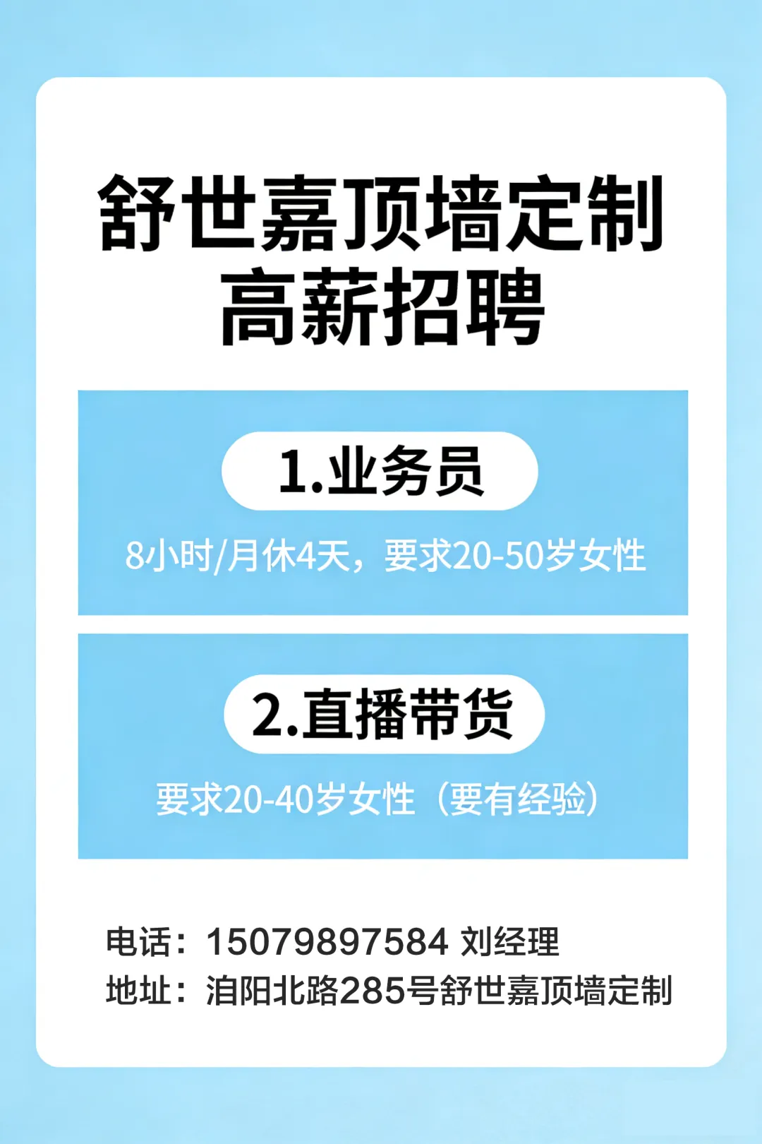 招聘企业:舒世嘉顶墙定制工作地址:洎阳北路285号舒世嘉顶墙定制