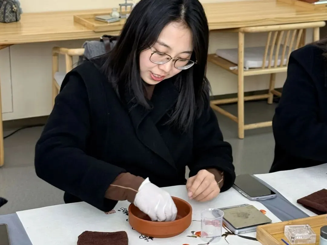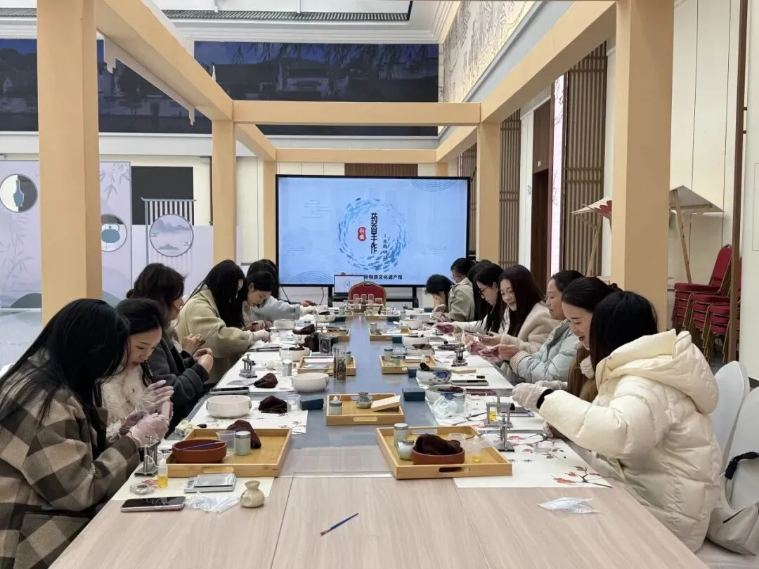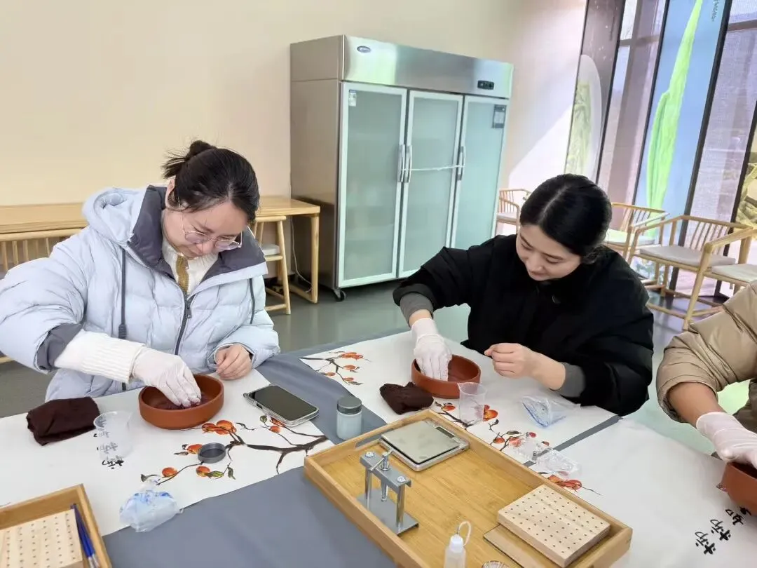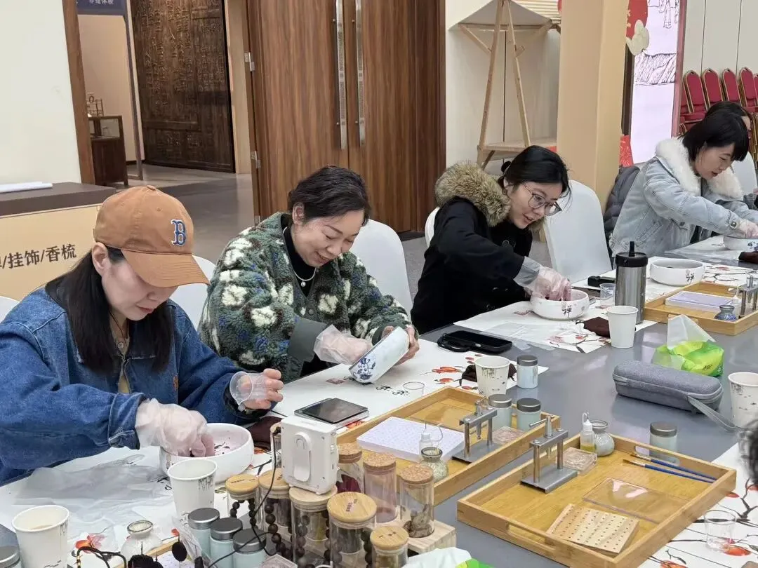 参观结束后,手作体验环节正式拉开帷幕。中药香牌与宋锦珍珠画两大经典项目,再次成为全场焦点,团队成员们热情高涨,全身心投入到指尖的匠心创作中。