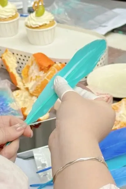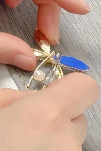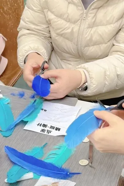 随后,在手作体验环节,各位女神领取了材料包——仿点翠羽毛、铜胎胸针、镊子……在指导老师的演示下,大家小心翼翼地修剪羽毛、涂抹胶水、精心粘贴。平日握鼠标的手,此刻执起镊子,专注而轻柔,静心感受非遗手作的慢与雅。一片片翠羽在指尖翩然起舞,逐渐幻化成各种胸针等精美饰品。