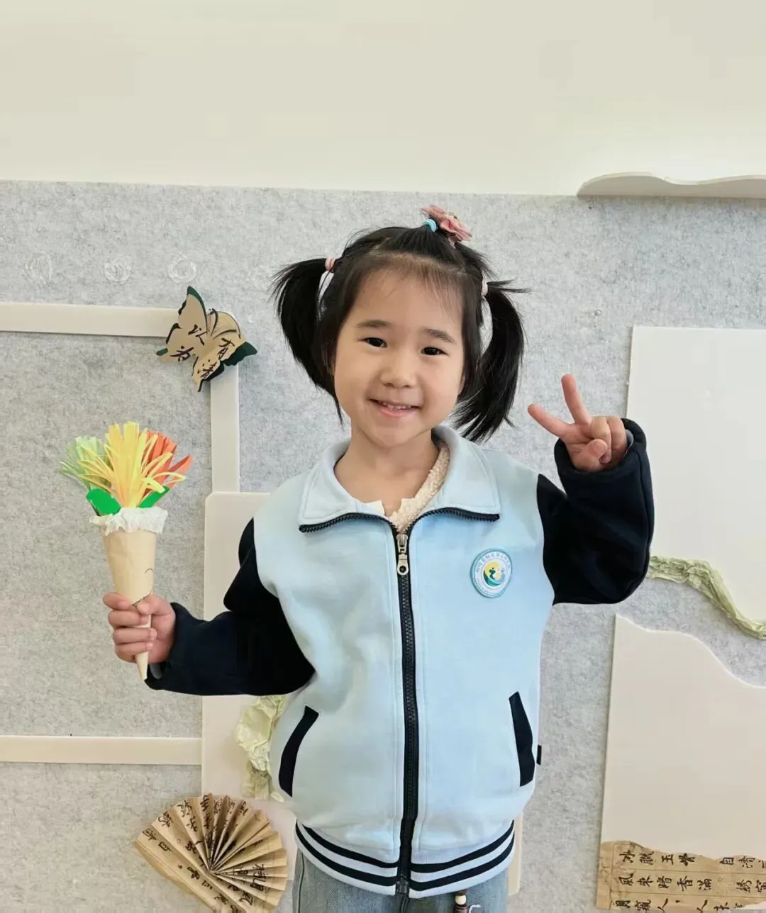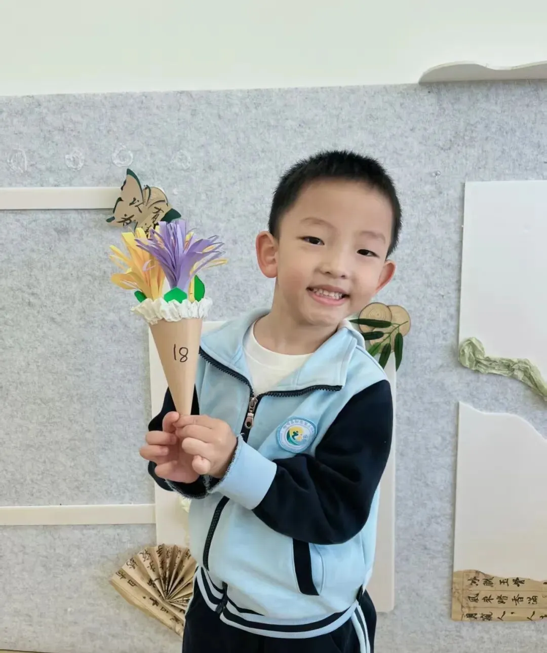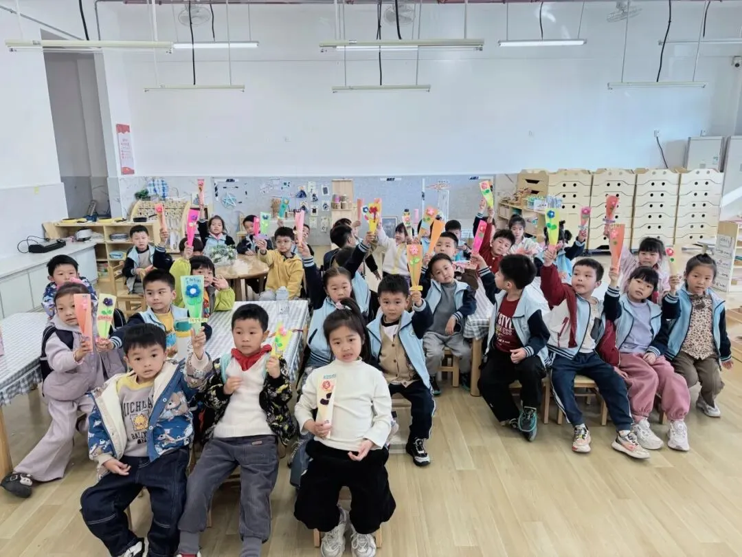孩子们把纸艺花插进牛皮纸花筒,还点缀上可爱的装饰,让这份春日的美好永不凋零,把对女性长辈的祝福,都藏进这束亲手制作的花里。