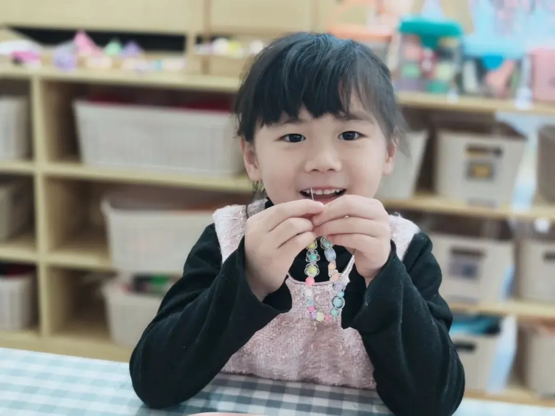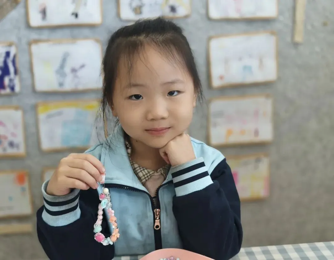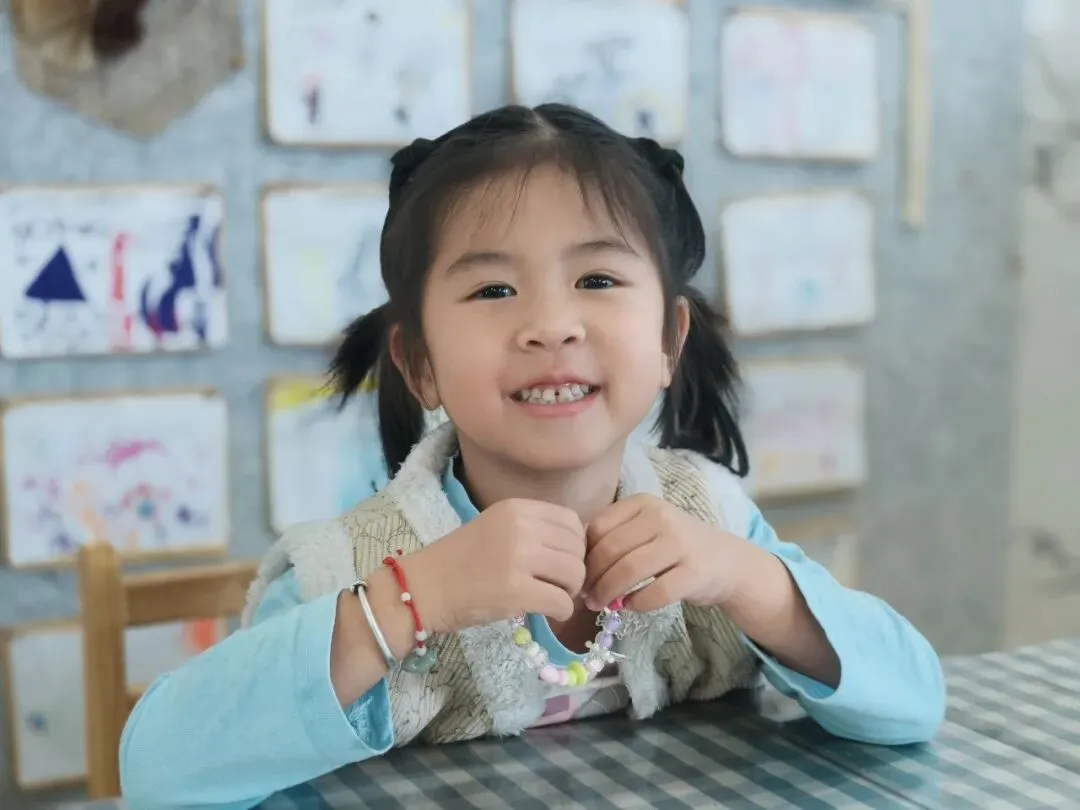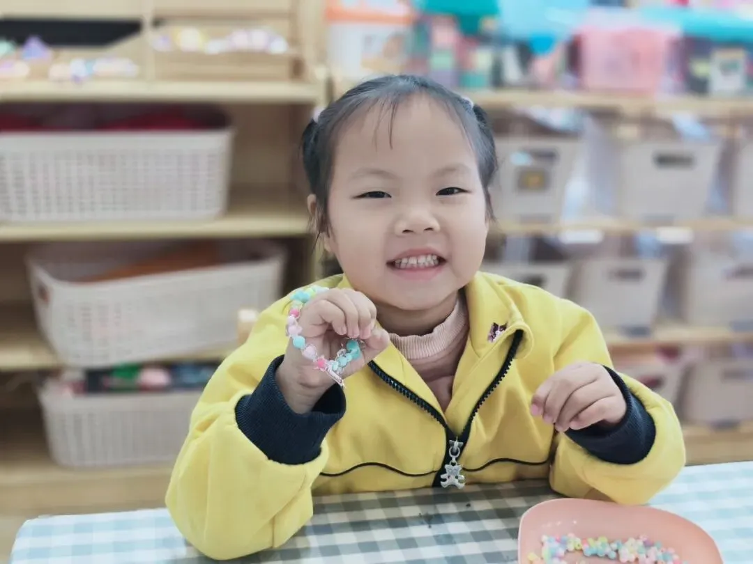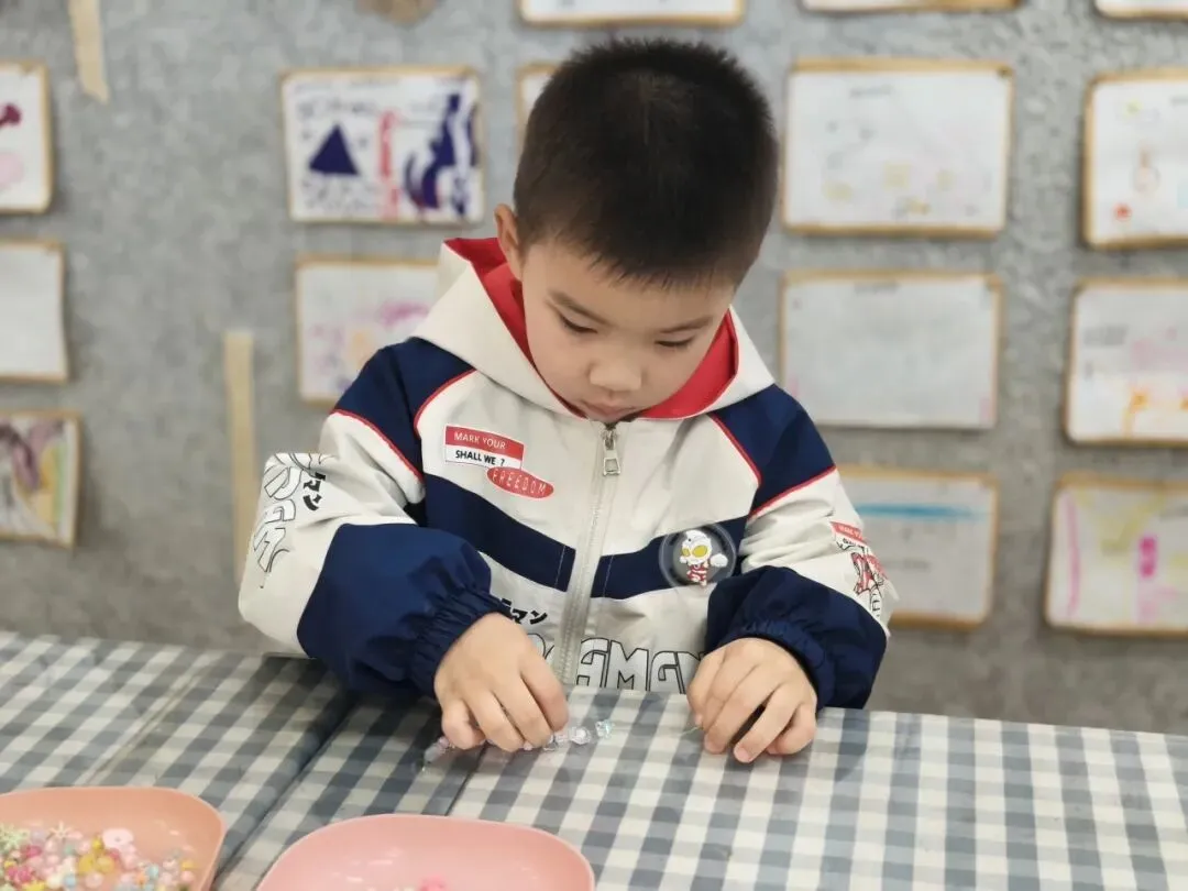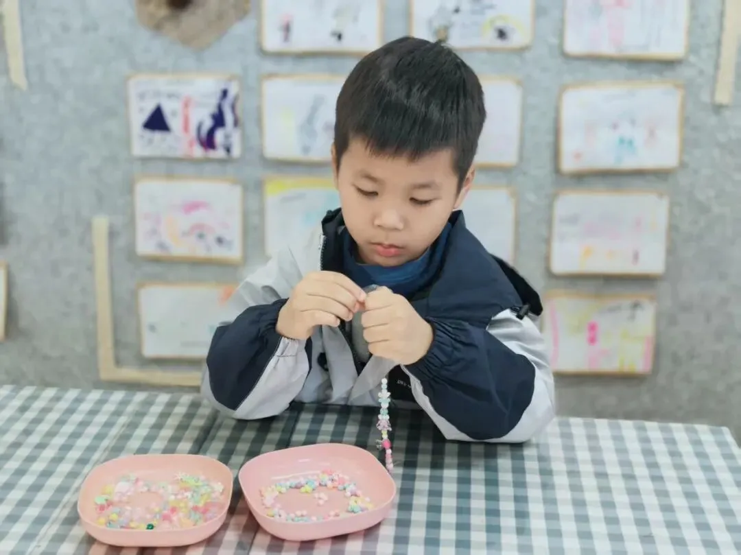 小小的珠子,细细的线,孩子们屏住呼吸,专注地把一颗颗彩色珠子串起来。