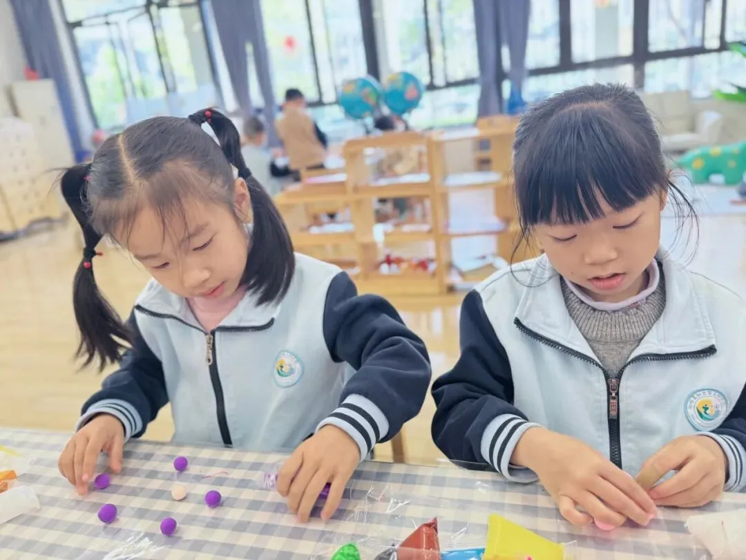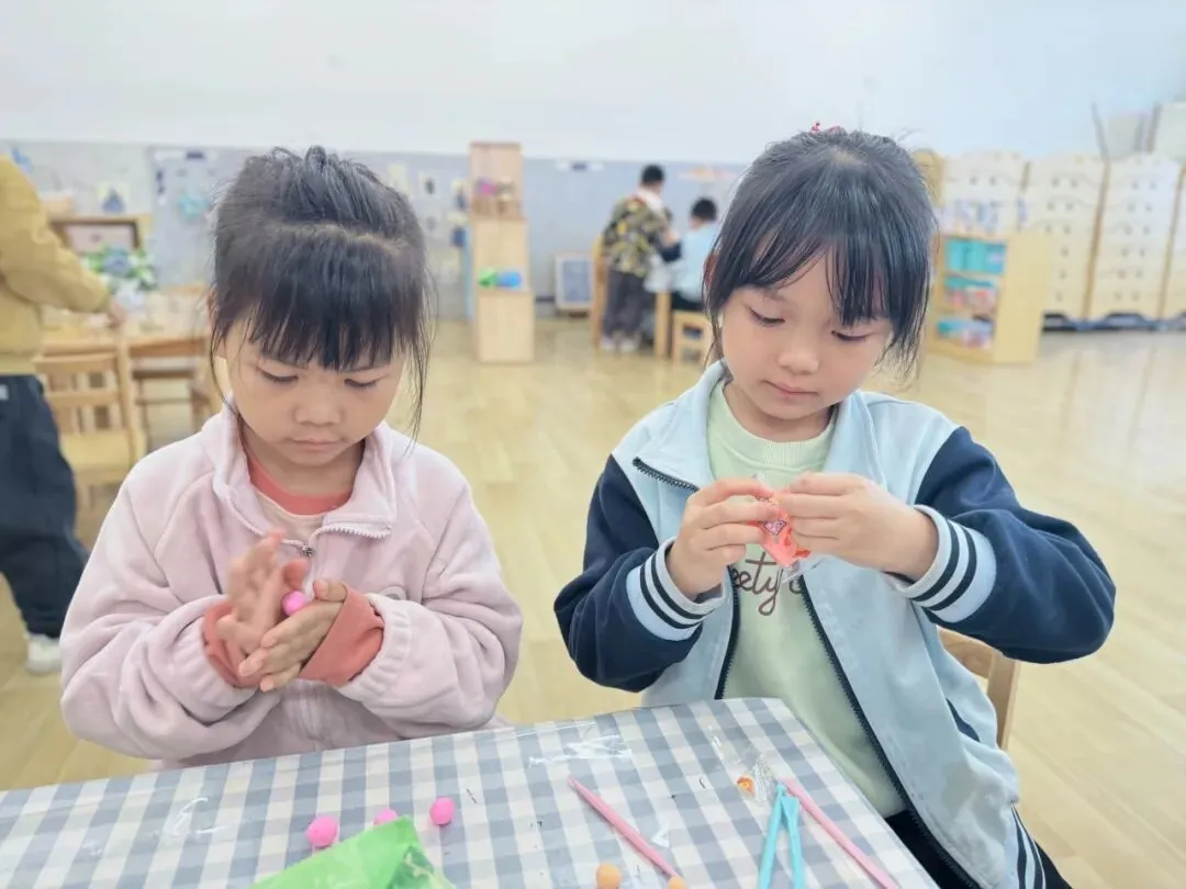 彩泥在小手里轻轻揉搓,粉色、紫色、橙色的花瓣慢慢成型,再配上翠绿的叶子,一朵朵鲜活的小花就诞生啦!