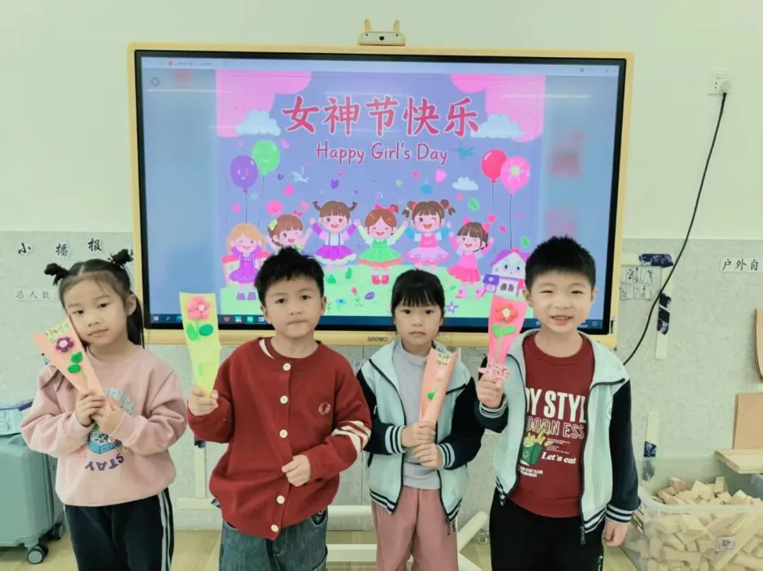 孩子们还细心地把花朵装进彩色纸套,贴上写着“女神节快乐”的小纸条,每一笔稚嫩的字迹,都是最真诚的告白。