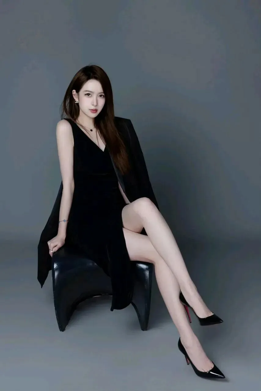 黑色丝绒吊带裙的垂坠肌理,与oversize黑西装的硬朗线条形成奇妙的平衡。她斜倚在异形黑色座椅上,双腿交叠的瞬间,红底高跟鞋在灰调背景里划出一抹亮眼的红,成为画面的点睛之笔;宽松的西装随意搭在肩头,露出精致的肩颈线条,冷白肌肤与黑色服饰的碰撞,让每一个肢体动作都带着利落的飒气。指尖轻抵脸颊的姿态,眼眸直视镜头时的坚定,将“都市大女主”的气场展现得淋漓尽致,而丝绒面料的柔滑又消解了西装的凌厉,让这份酷飒多了几分女性的柔媚。
