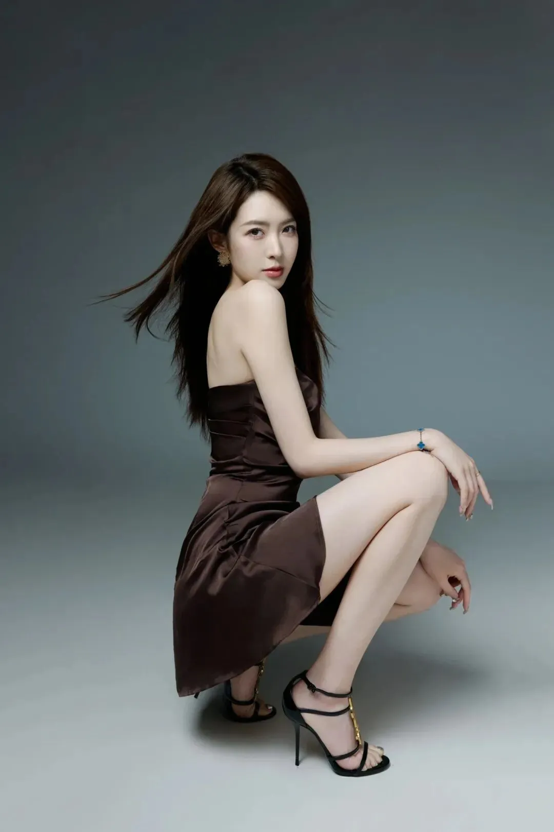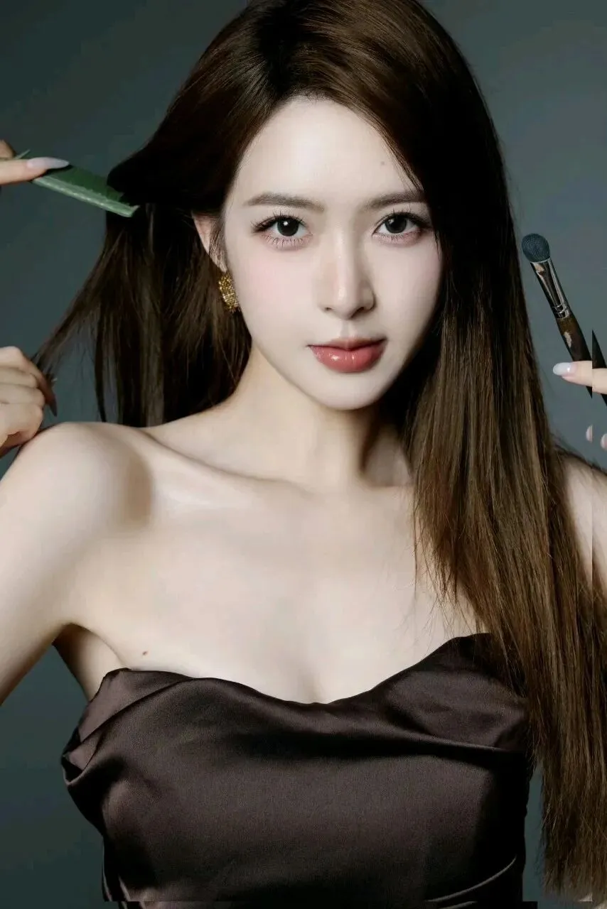 当镜头切换到咖色缎面抹胸裙,风格的转变又带来全新的惊艳。哑光的咖色缎面在光影里泛着细腻的光泽,抹胸设计将锁骨与肩颈的优美弧度尽数展现,金色耳饰的点缀,为整体造型添了几分复古的优雅。她单手叉腰站在镜头前,发丝被风吹起的瞬间,眉眼间的慵懒与温柔扑面而来;蹲坐的姿态里,缎面裙摆自然垂落,与黑色细带高跟鞋呼应,咖色的暖调中和了背景的冷灰,让画面多了几分法式浪漫的氛围。而化妆刷与梳子环绕的镜头里,她如同聚光灯下的主角,在造型的雕琢中,展现出从容又自信的状态。