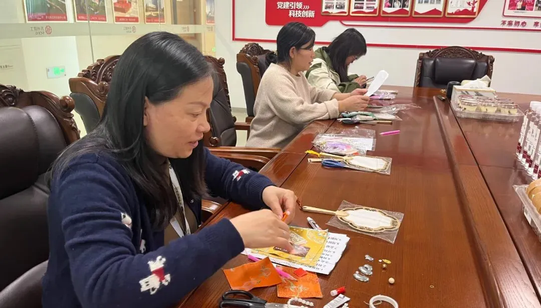 创作环节中,现场氛围温馨而热烈,各位女神们褪去工作的忙碌,全身心投入到手工创作中。大家围坐在一起,剪面料、穿丝线、缝挂件、缀流苏,指尖翻飞间,一块块素雅的宋锦面料,经过精心裁剪与缝制,逐渐变成了造型精致、寓意美好的手工挂件。有的专注细致,一针一线都力求完美;有的相互交流,分享制作心得与创意灵感;有的轻声欢笑,不时展示自己的半成品,脸上洋溢着幸福的笑容。集团还精心准备了精致的下午茶,摆放着香甜的糕点、清爽的饮品,让大家在创作间隙能够放松身心、补充能量,在味蕾的愉悦中增进彼此的情谊,整个现场暖意融融、其乐融融,处处充满了欢声笑语与温情暖意
