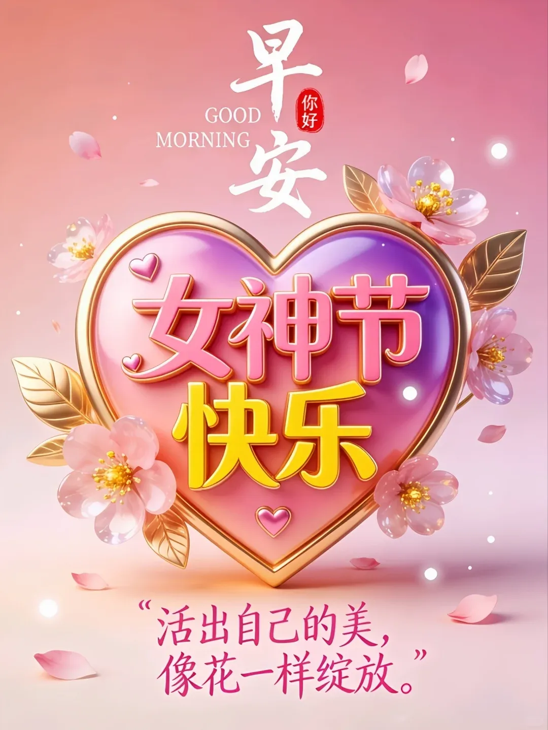 3. ✨ 早安,亲爱的朋友们!今天三八妇女节,愿所有女性朋友,都能活成自己喜欢的样子。不讨好、不将就、不慌张,在平凡的日子里,慢慢绽放,悄悄闪耀。愿你心中有梦,脚下有路,生活有惊喜,未来有期待,节日快乐,岁岁安康!
