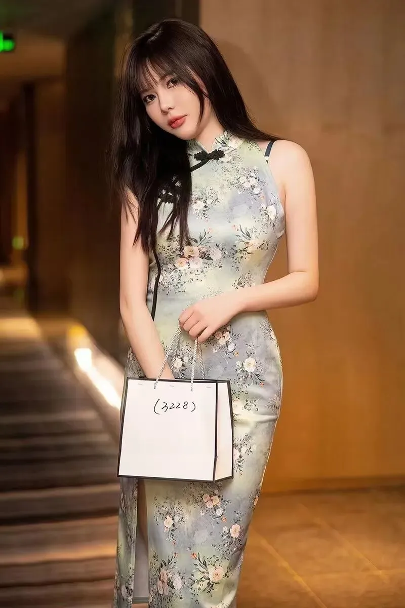 - 发型:自然微卷的长发,搭配空气刘海,既修饰了脸型,又增添了一丝慵懒和柔媚,与旗袍的温婉气质完美融合。