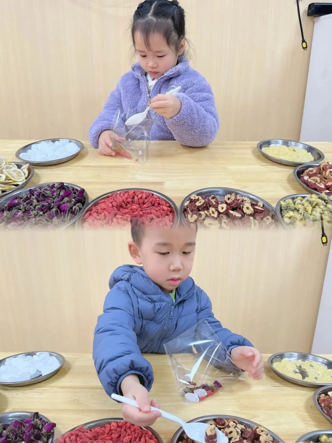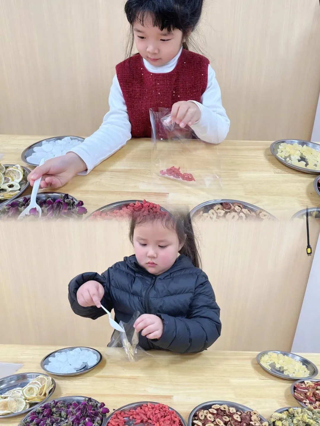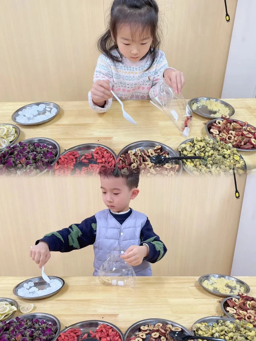 小朋友们认认真真挑选、小心翼翼分装