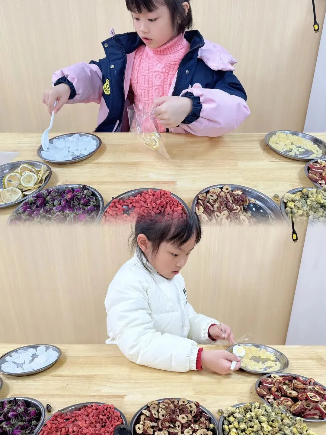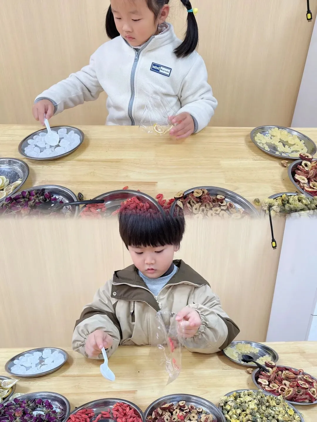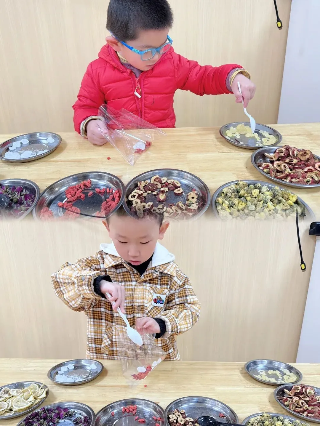 小朋友们认认真真挑选、小心翼翼分装