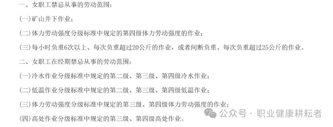 2.1经期禁止安排高处、低温、冷水作业及第三级体力劳动;可申请调整劳动强度或休息。