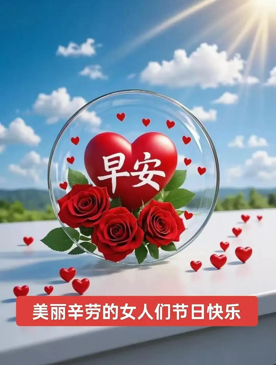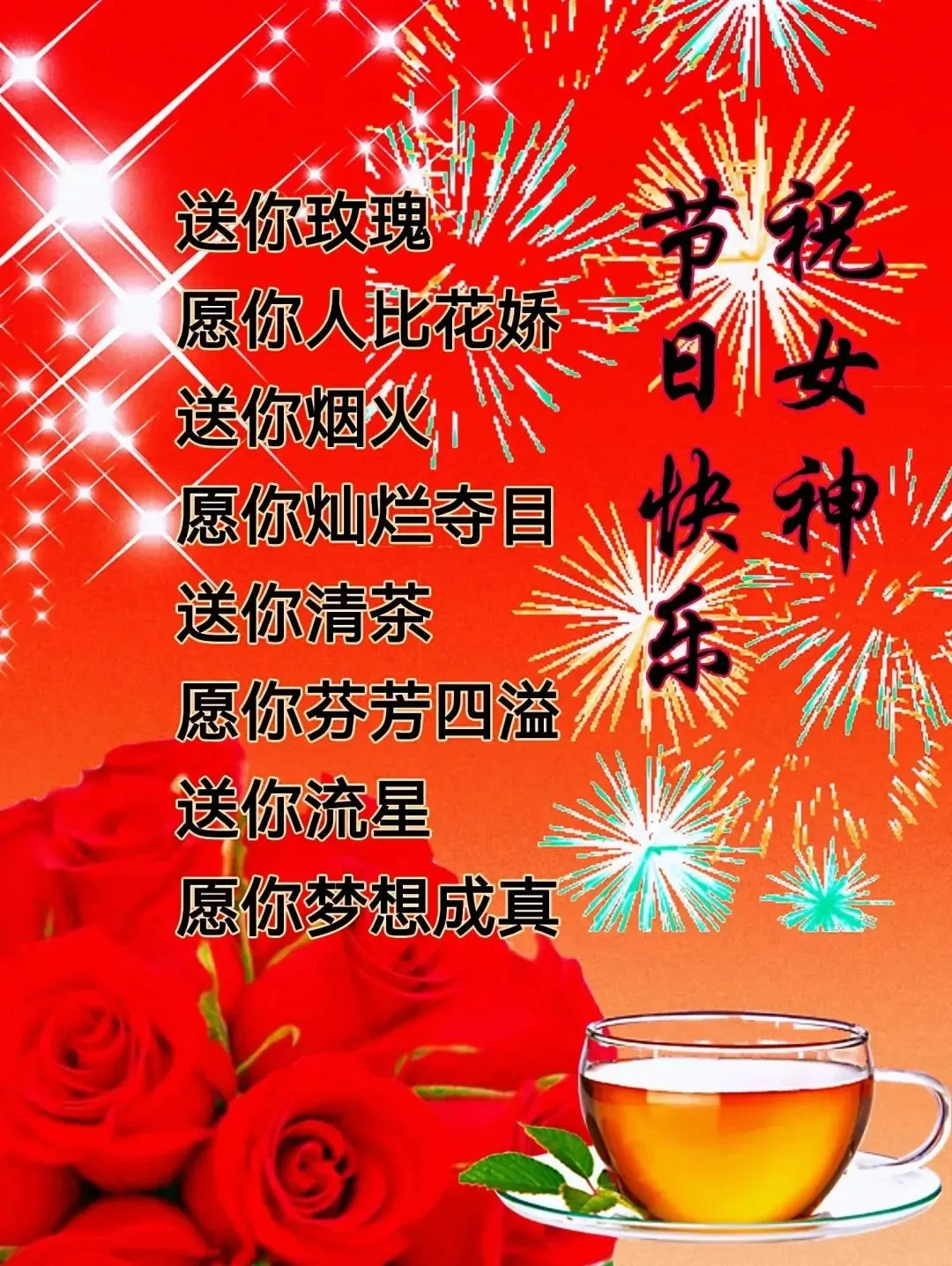 送你三月的风,吹走你的烦恼。送你三月的雨,滋润你的心田。送你三月的花,点缀你的容颜。送你一整个春天,愿你的生活阳光灿烂,妇女节快乐!🌹🍎😊🌺🌞🎉
