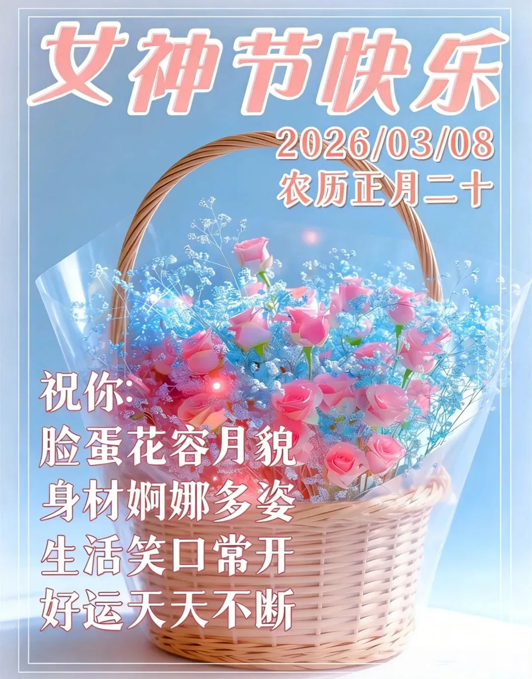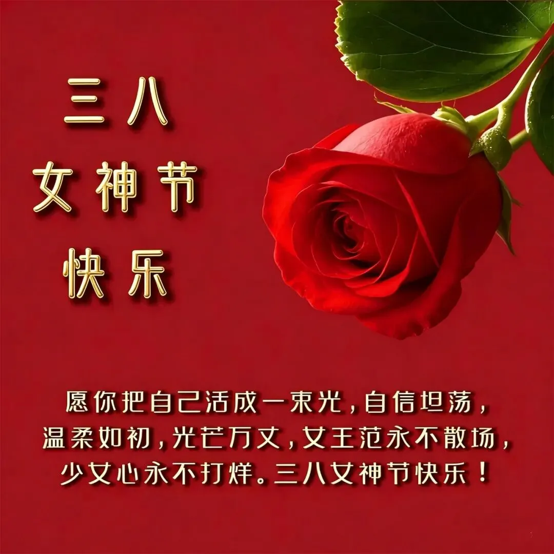 三八妇女节,愿您:心中有爱,眼中有光,脸上有笑,身上有暖。平安健康,自在从容,快乐不止今天,幸福不止一年!