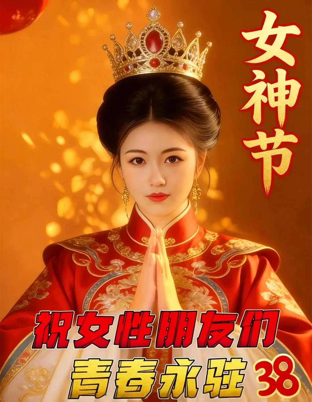 莫问年岁,女神万岁,今天是女神节,祝你,祝我,祝我们所有女神,好运一起走,健康一起守,平安手牵手,幸福共拥有,活得轻松,老的漂亮,不管几岁,开心万岁,祝所有女神节日快乐!