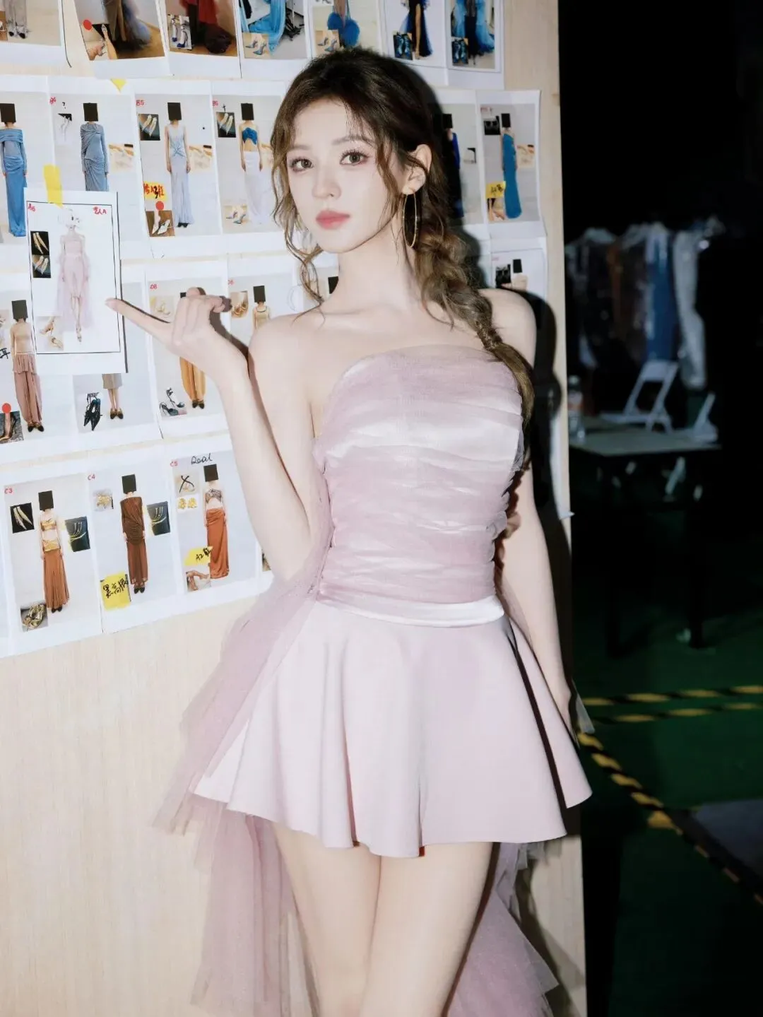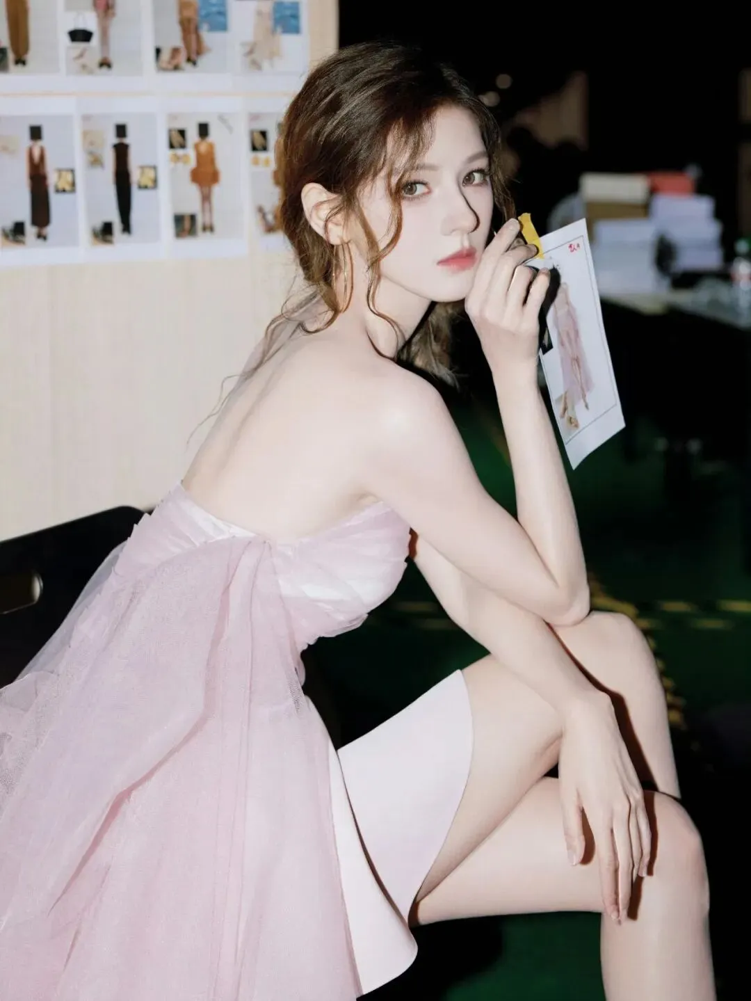 这组照片厉害就厉害在它拍的是后台,而且拍出了后台特有的那种忙而不乱的感觉。背景板上贴满了服装设计稿,各种草图、面料小样钉在上面,一看就知道这是正经的时尚秀场,不是随便搭的景,那种专业的创作氛围一下子就出来了。而且摄影师很会抓,捕捉的是她在后台的多个瞬间,不是那种正儿八经盯着镜头笑的摆拍。