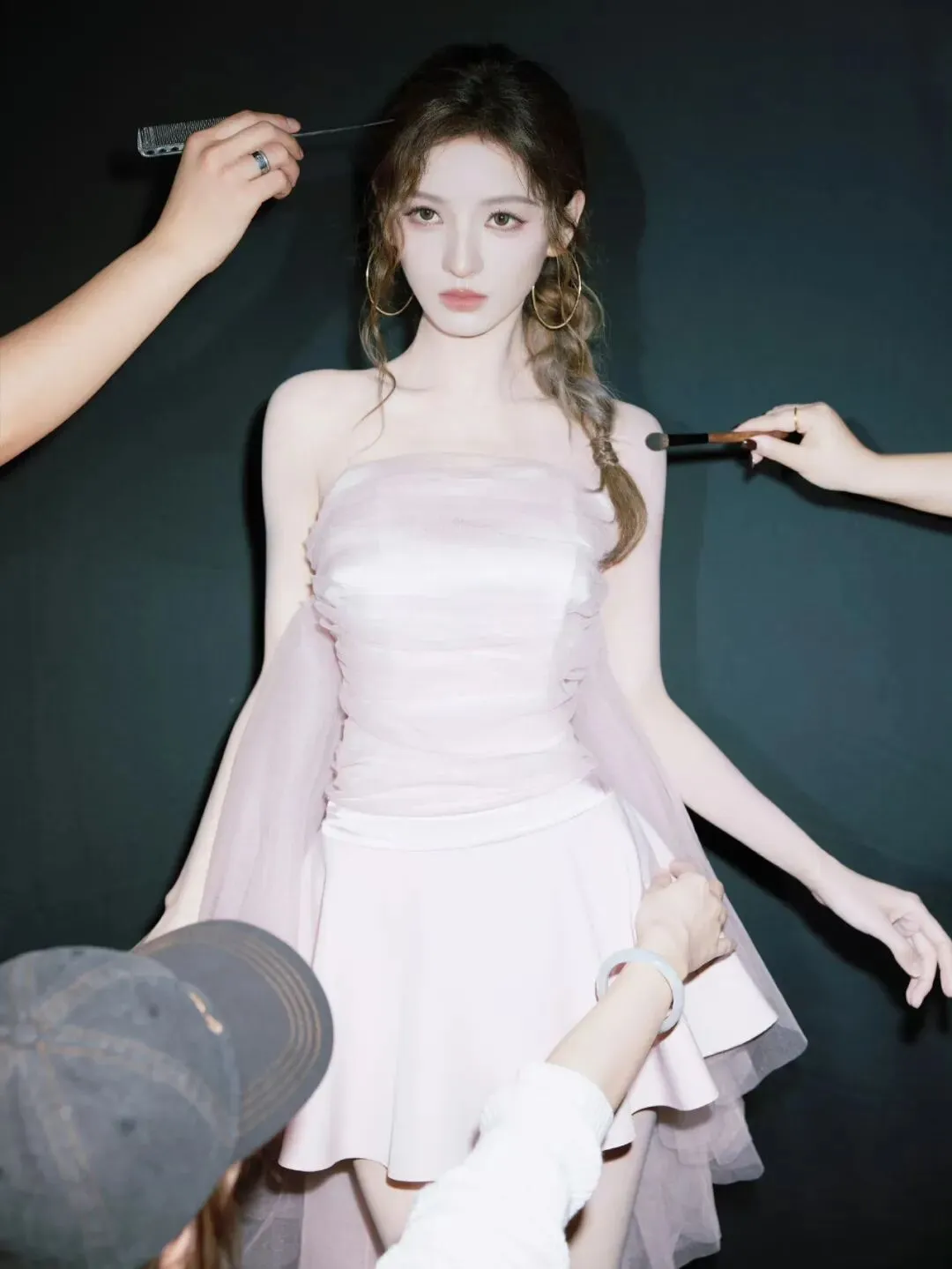 比如有一张她手里拿着设计稿,低着头看,眼神特别专注,好像在跟设计师确认某个细节,那种投入的状态特别真实;还有一张她被造型团队围在中间,发型师在弄头发,化妆师在补妆,好几个人同时在她身上忙活,她坐在那儿特别从容淡定,该抬头抬头,该闭眼闭眼,一看就是经历过无数场这种阵仗的人,心里有底,不慌张。