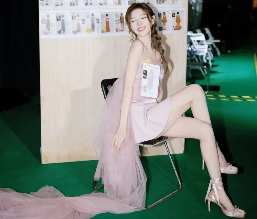 脚上穿的是缎面舞鞋,还缠绕着丝带,一直绕到脚踝上面。这个设计跟纱裙那种飘逸感正好呼应上了,就好像是从童话故事里走出来的芭蕾舞者,每一步都让人觉得轻盈优雅。你想象一下,如果她穿一双细跟高跟鞋,整个感觉就变了,会更有攻击性,更“红毯”,但舞鞋一穿,那种不食人间烟火的仙女气就保住了。