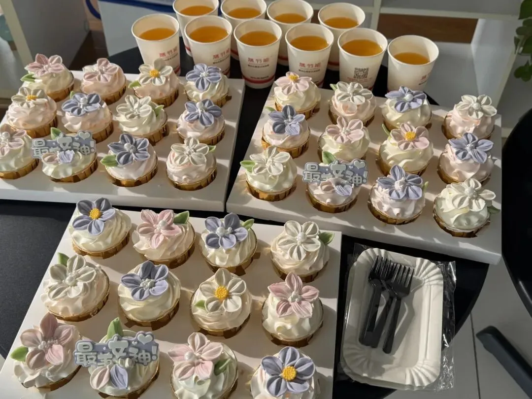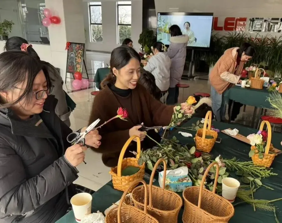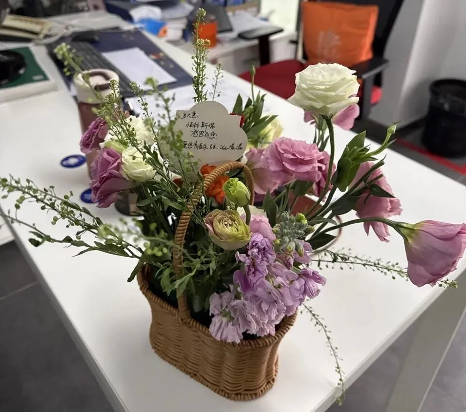 长桌上摆满了娇艳欲滴的玫瑰、清新淡雅的康乃馨以及充满生机的绿植。空气中弥漫着淡淡的花草香气,瞬间抚平了大家工作的疲惫。