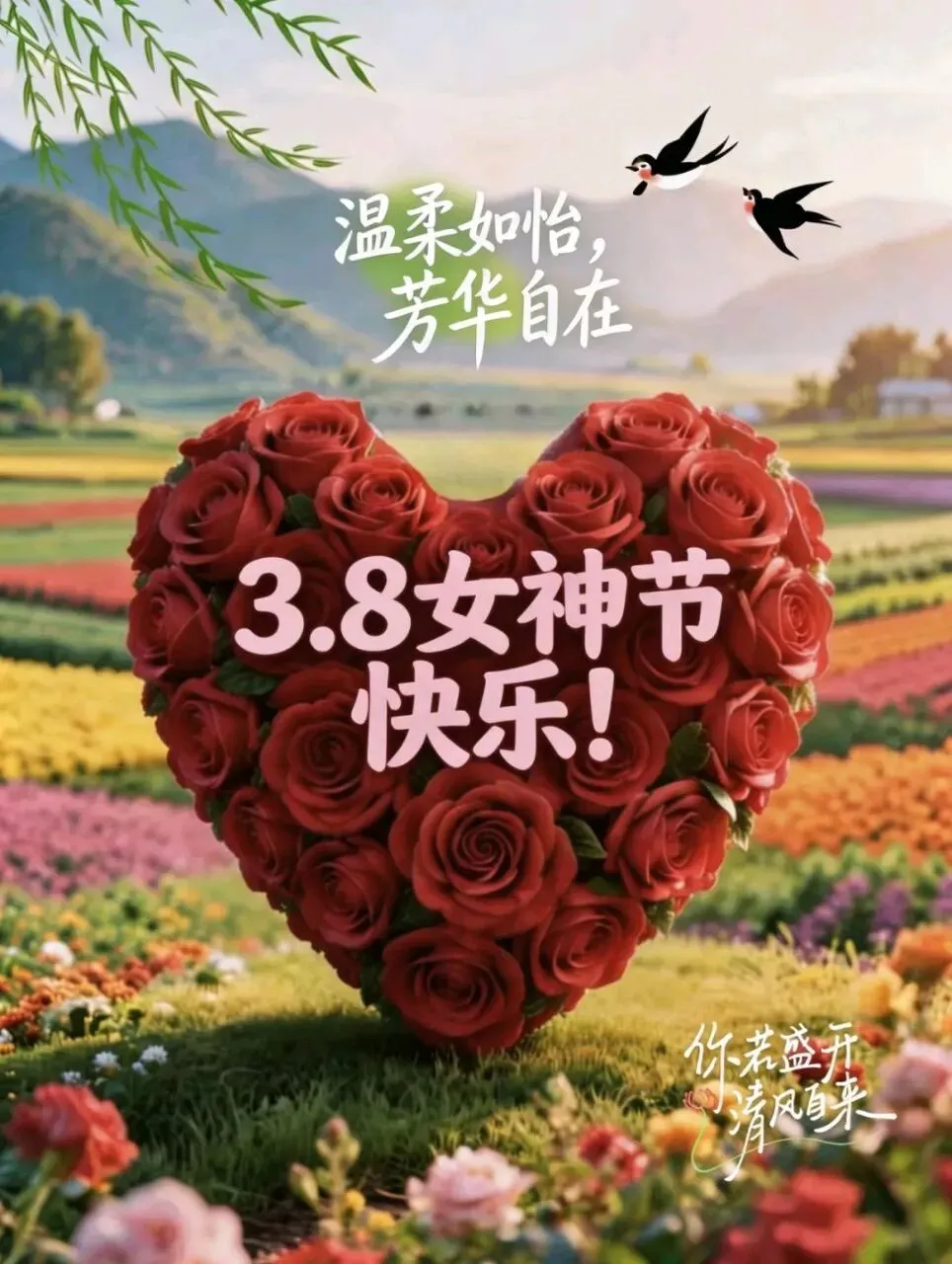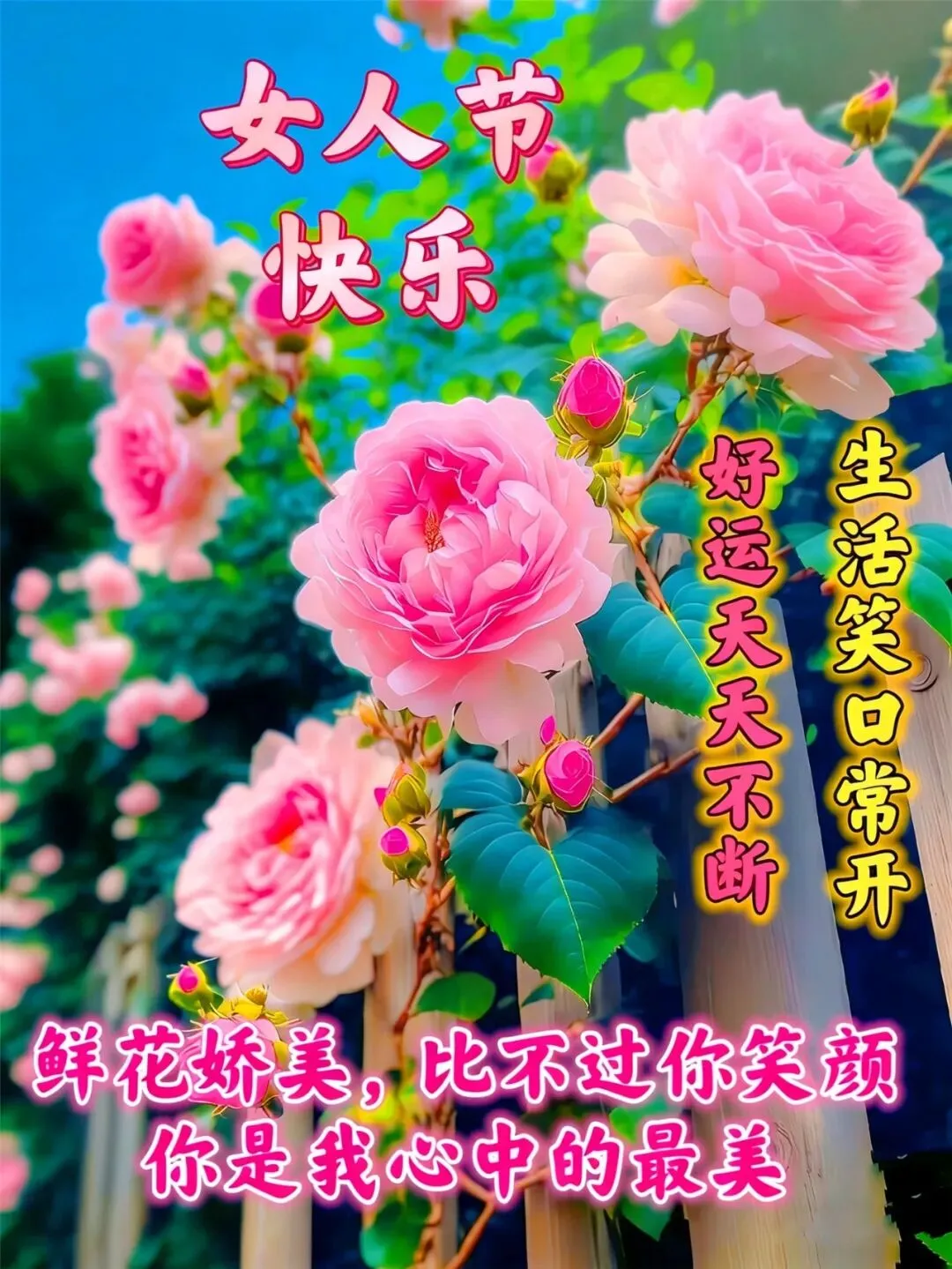 送你三月的风,吹走你的烦恼。送你三月的雨,滋润你的心田。送你三月的花,点缀你的容颜。送你一整个春天,愿你的生活阳光灿烂,妇女节快乐!三八妇女节,愿您:心中有爱,眼中有光,脸上有笑,身上有暖。平安健康,自在从容,快乐不止今天,幸福不止一年!