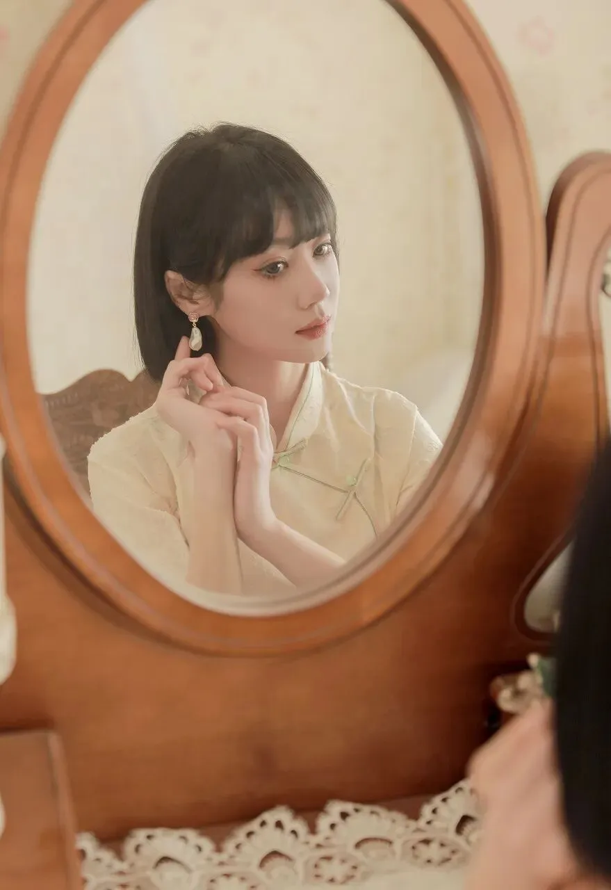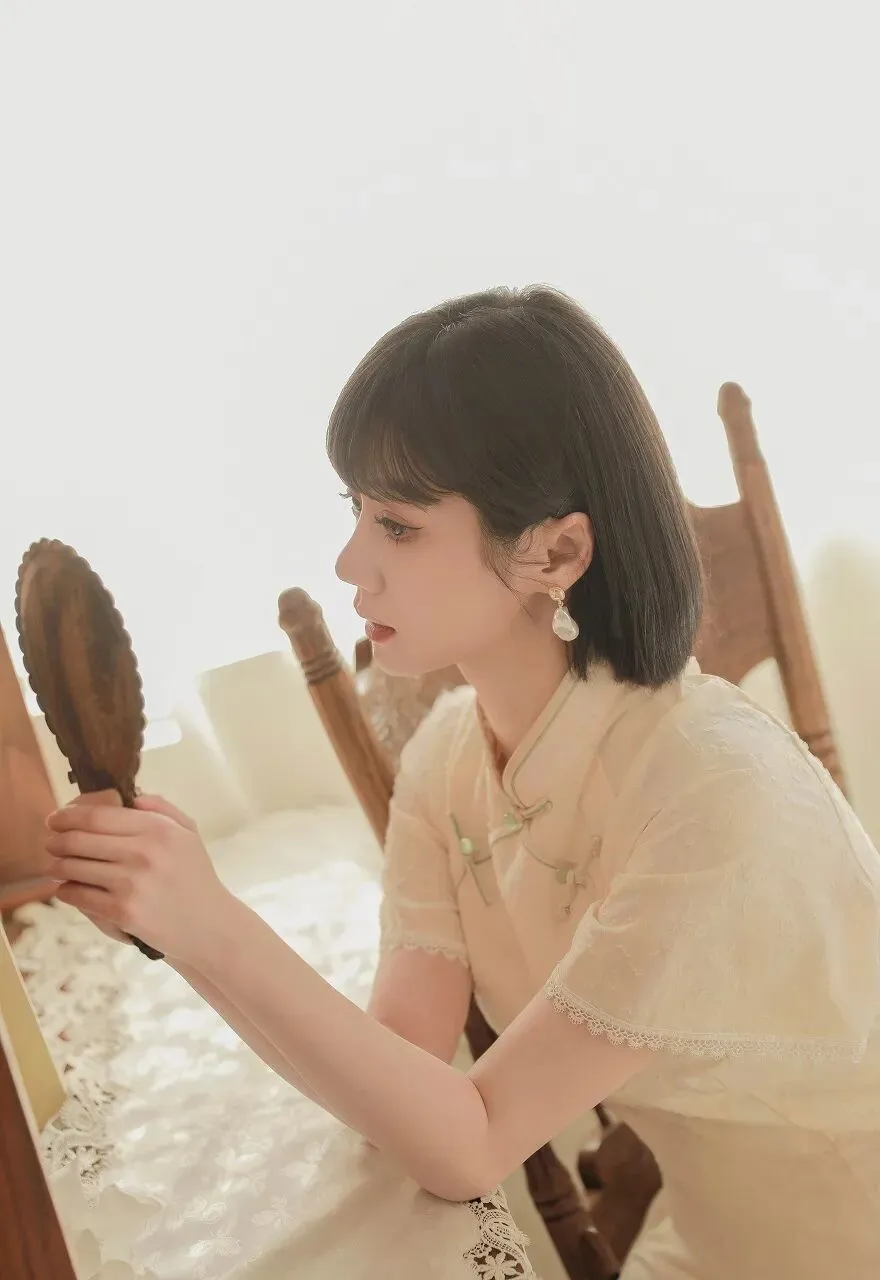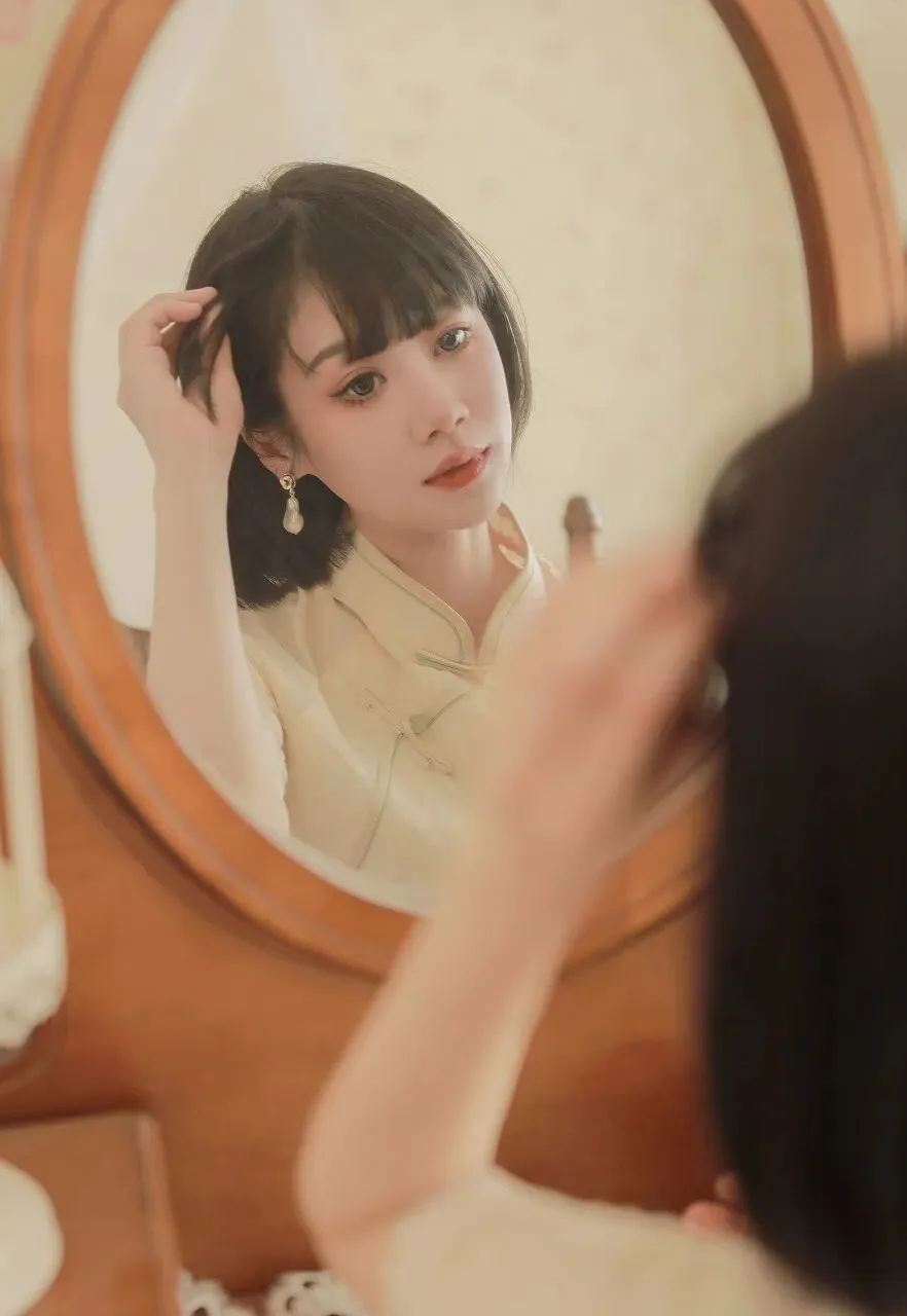 在时光的长河中,总有一些瞬间,能温柔岁月,惊艳时光。一位身着浅黄色旗袍的短发少女,静坐在木椅旁,手持古镜,对镜凝思,宛如从旧时光中走来的画中人,带着独有的温婉与静谧,诉说着一段无声的故事。少女身着的旗袍,是浅黄色的温柔。那颜色,似春日里初绽的迎春花,清新而明亮,又似秋日中温暖的阳光,柔和而恬静。旗袍上精致的提花纹理,细腻而典雅,仿佛是时光精心雕琢的图案,每一处都蕴含着岁月的韵味。领口处的盘扣设计,小巧而精巧,以绿色的丝线点缀,宛如翠绿的枝叶衬托着娇嫩的花朵,为整体造型增添了一抹灵动的生机。旗袍的袖口和衣摆处,蕾丝花边若隐若现,似是少女心底的柔情,婉约而含蓄。她的短发整齐而利落,发梢微微内扣,衬托出她精致的脸庞。齐刘海下,一双明亮的眼眸如同一汪清泉,清澈而深邃。此刻,她正微微侧着头,目光专注地落在手中的古镜上,眼神中流露出一丝沉思与温柔。她耳畔垂下的珍珠耳环,圆润而光泽,随着她的动作轻轻晃动,更添几分优雅的气质。
