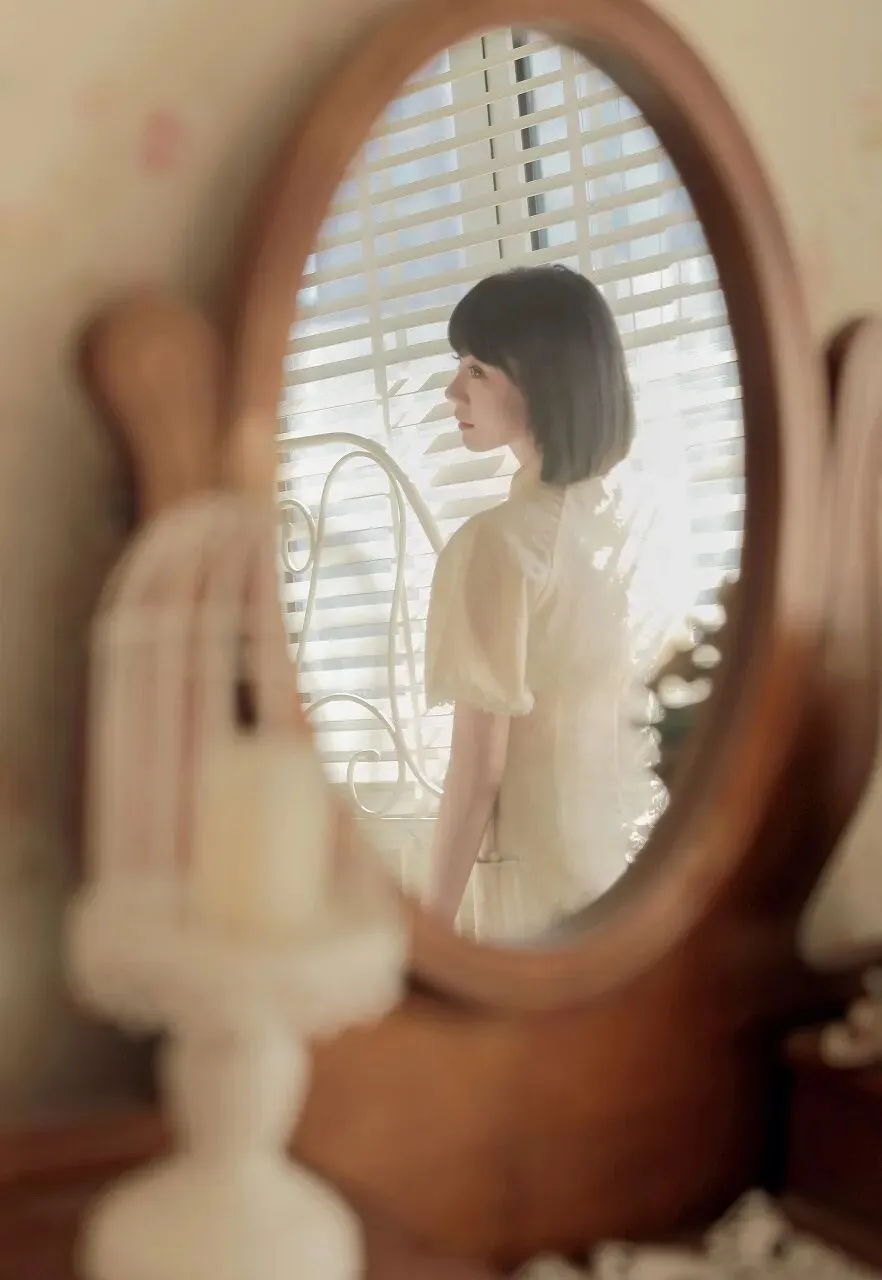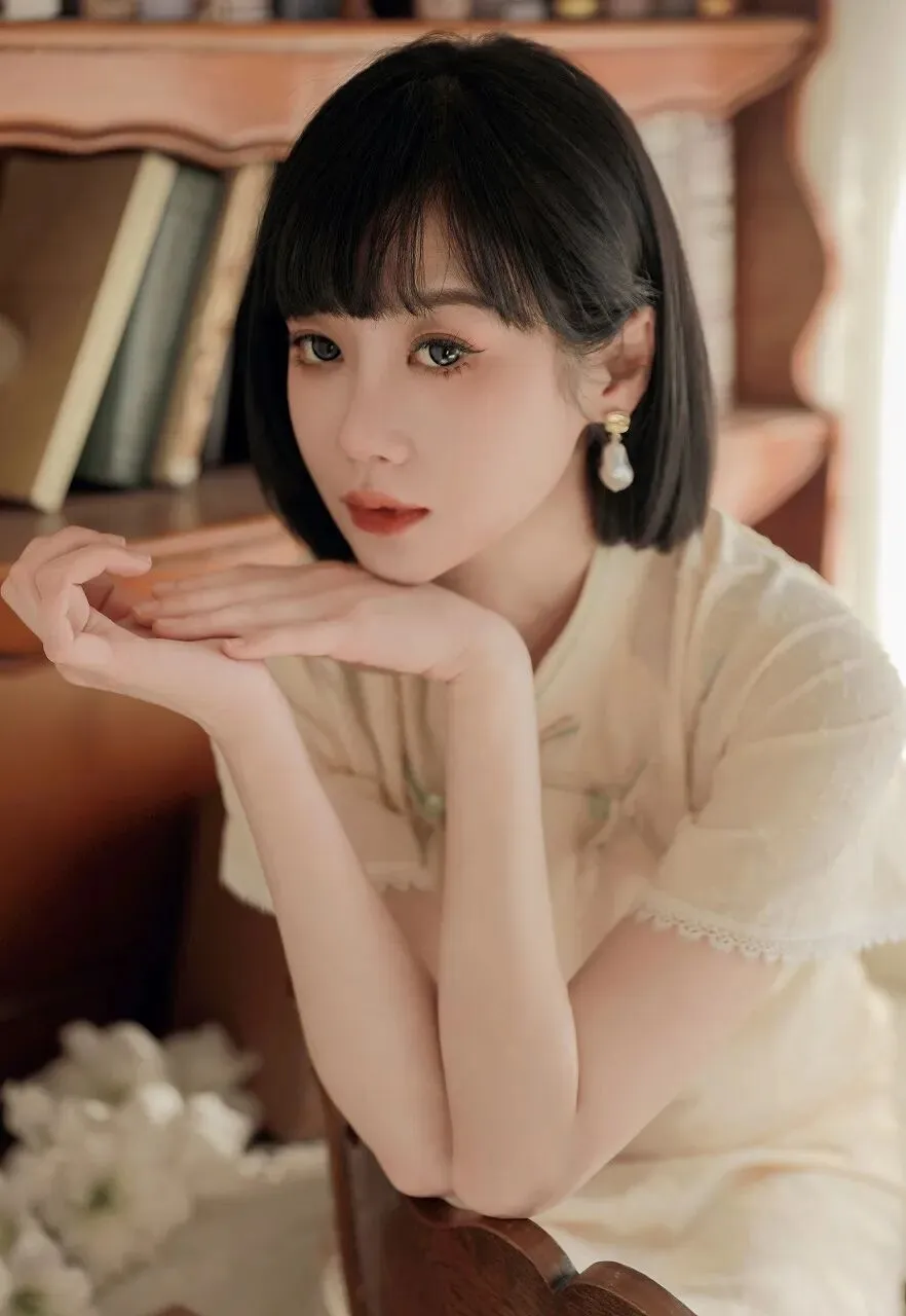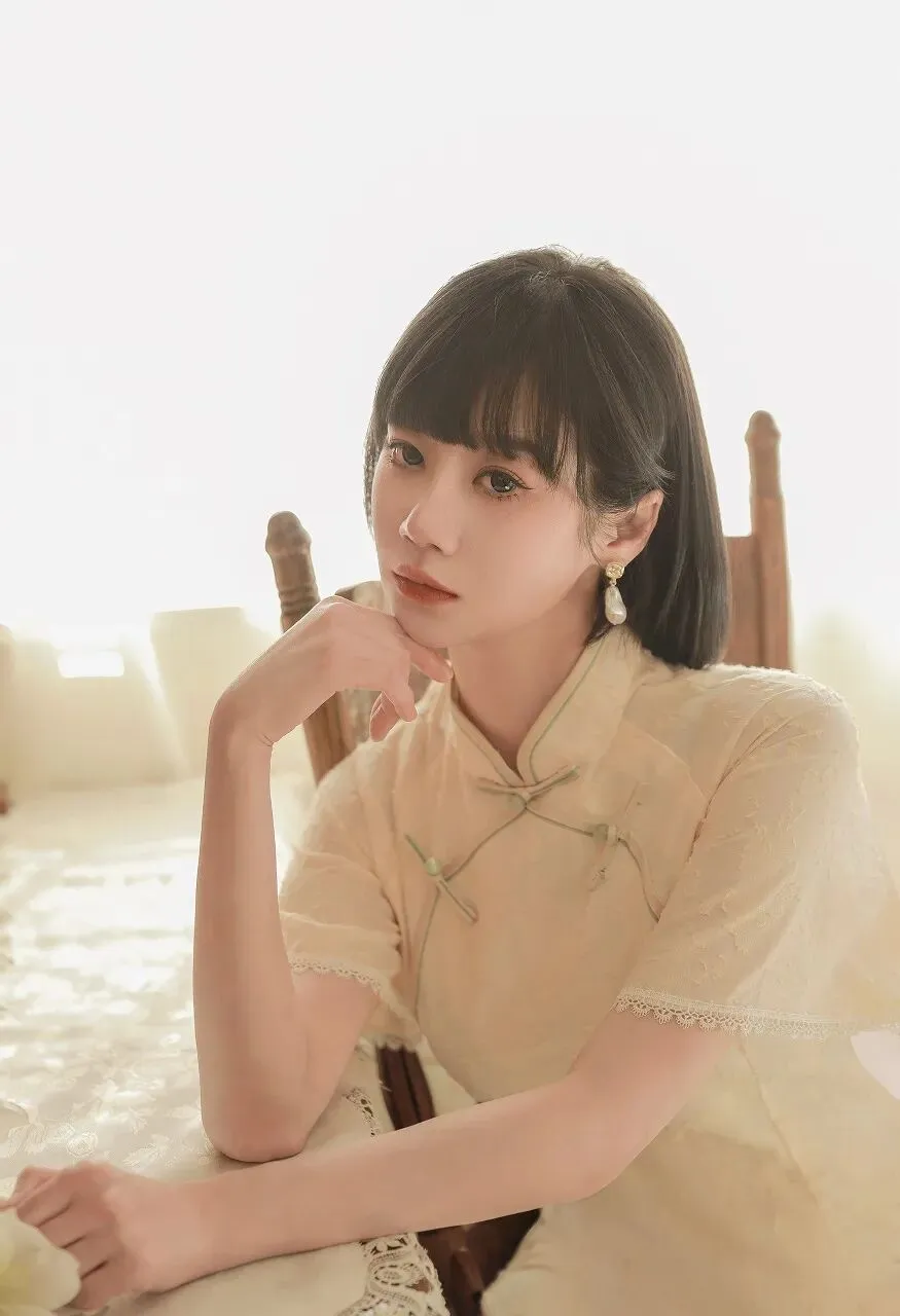 在时光的长河中,总有一些瞬间,能温柔岁月,惊艳时光。一位身着浅黄色旗袍的短发少女,静坐在木椅旁,手持古镜,对镜凝思,宛如从旧时光中走来的画中人,带着独有的温婉与静谧,诉说着一段无声的故事。少女身着的旗袍,是浅黄色的温柔。那颜色,似春日里初绽的迎春花,清新而明亮,又似秋日中温暖的阳光,柔和而恬静。旗袍上精致的提花纹理,细腻而典雅,仿佛是时光精心雕琢的图案,每一处都蕴含着岁月的韵味。领口处的盘扣设计,小巧而精巧,以绿色的丝线点缀,宛如翠绿的枝叶衬托着娇嫩的花朵,为整体造型增添了一抹灵动的生机。旗袍的袖口和衣摆处,蕾丝花边若隐若现,似是少女心底的柔情,婉约而含蓄。她的短发整齐而利落,发梢微微内扣,衬托出她精致的脸庞。齐刘海下,一双明亮的眼眸如同一汪清泉,清澈而深邃。此刻,她正微微侧着头,目光专注地落在手中的古镜上,眼神中流露出一丝沉思与温柔。她耳畔垂下的珍珠耳环,圆润而光泽,随着她的动作轻轻晃动,更添几分优雅的气质。