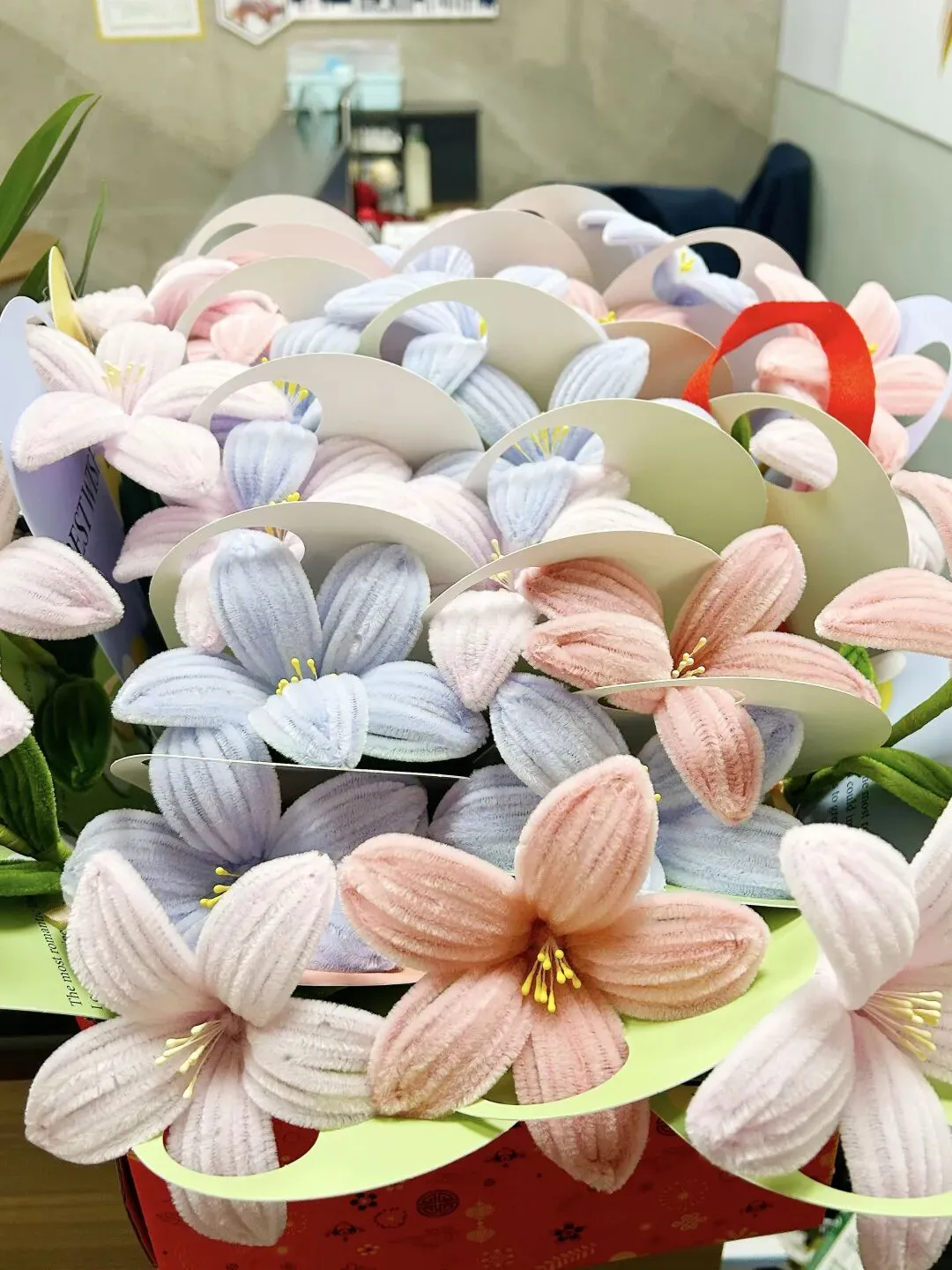 这一次,我们送出的不是普通的鲜花,而是由物业小姐姐们利用业余时间,亲手制作的手工扭扭花。
