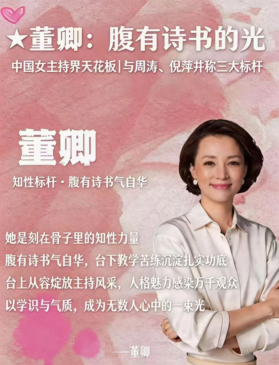 董卿是我心中最温柔也最有力量的一束光,她优雅从容、腹有诗书,一言一行都透着知性与风骨。她的主持沉稳大气、共情力极强,临场应变与文字功底更是令人折服。腹有诗书气自华,在她身上得到了最完美的诠释,也激励着无数人静下心来读书成长。她与周涛、倪萍一同被誉为主持界的标杆,台上的每一个眼神、每一句台词都尽显功底与魅力,而这一切,都源于台下日复一日的沉淀与坚持。