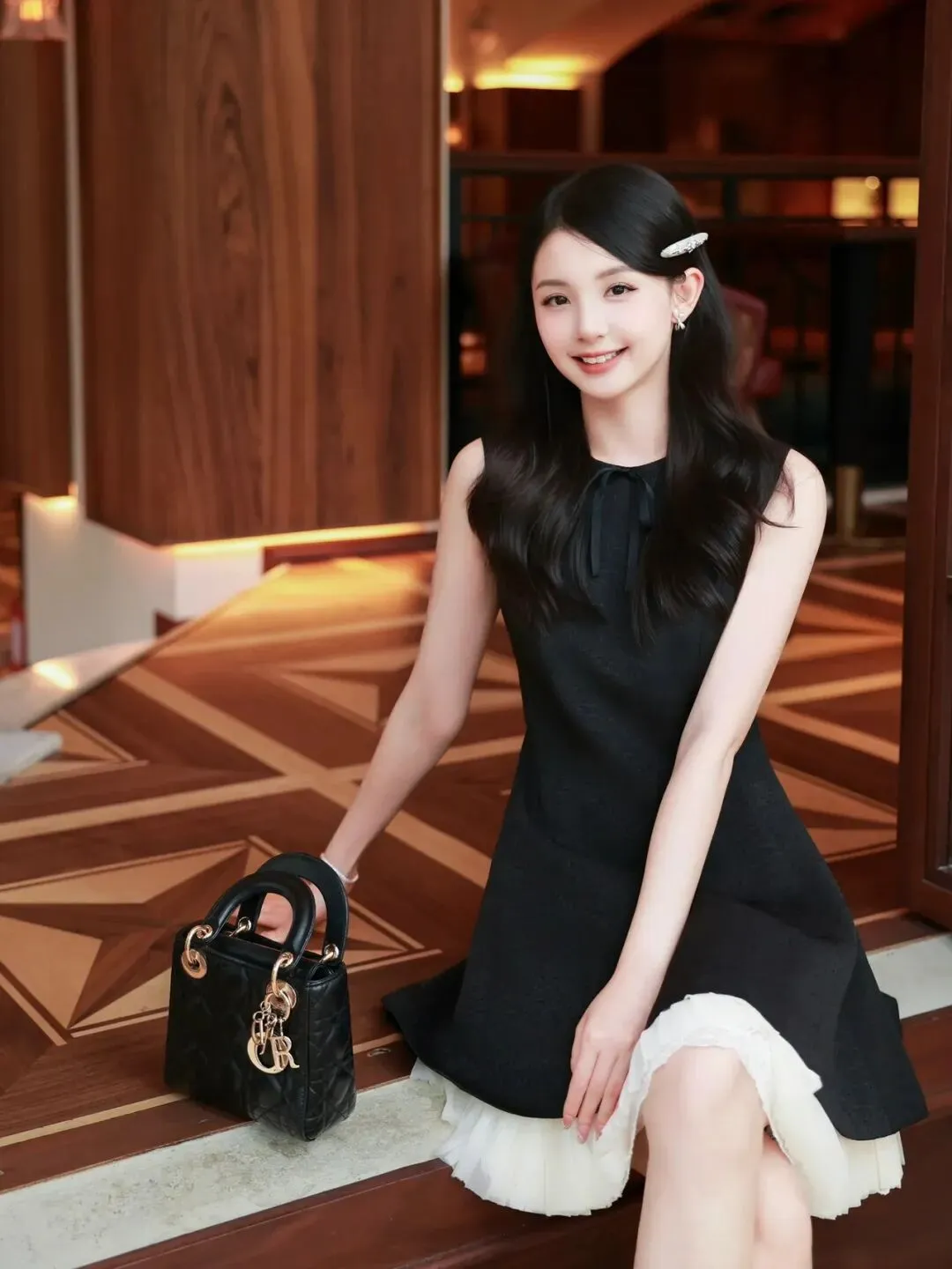 侧身坐在室内台阶上,一手轻搭手提包,一手轻放膝头,身体微微侧转,背景是几何拼花地板,姿势慵懒又优雅,高级感拉满。