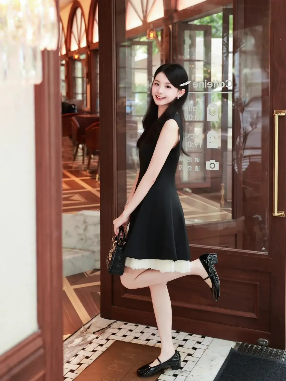 单手轻提包包,侧身站在玻璃门前,单腿自然抬起,身体微微侧转,背景是餐厅内饰,打破静态摆拍的拘谨,灵动又自然。