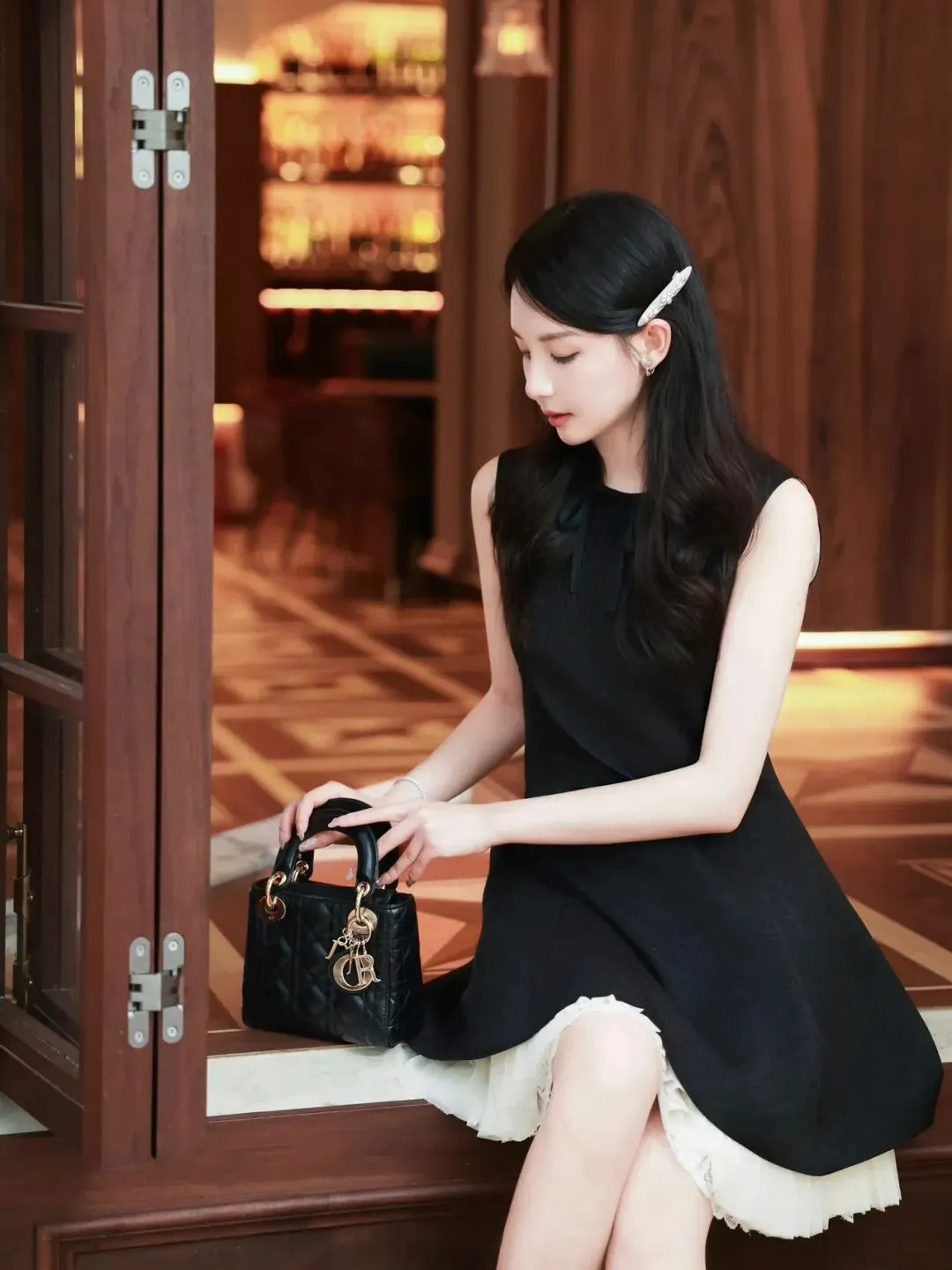 侧身坐在玻璃门侧沿,一手轻扶包包,一手自然垂落,身体微微侧转,背景是木质门框,显松弛又有格调,像不经意被抓拍。