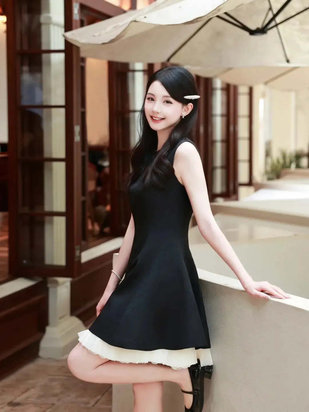 单手轻扶露台栏边,单腿自然抬起,身体微微侧转,背景是户外遮阳伞,俏皮又有细节,显灵动又有态度。