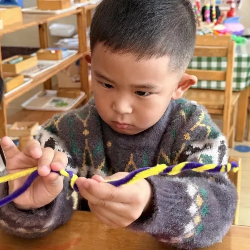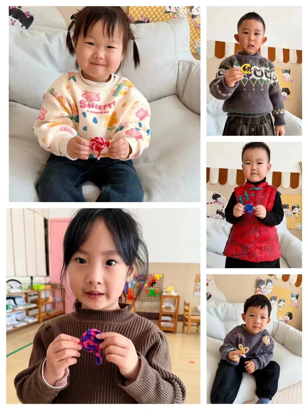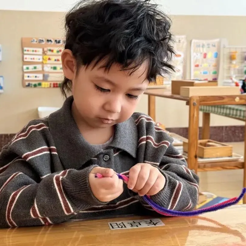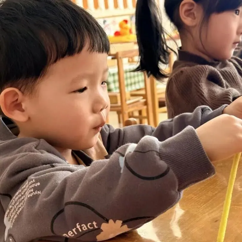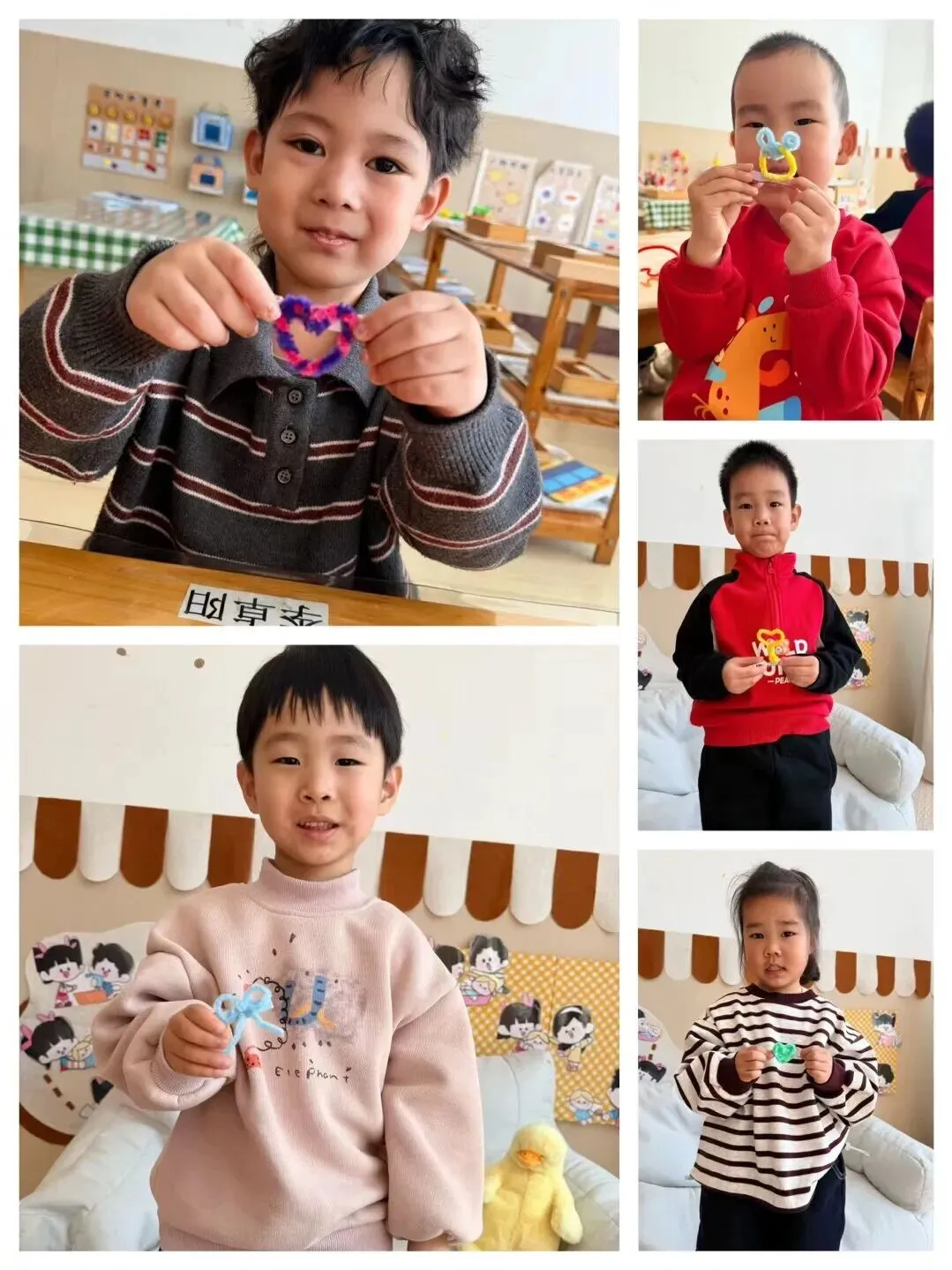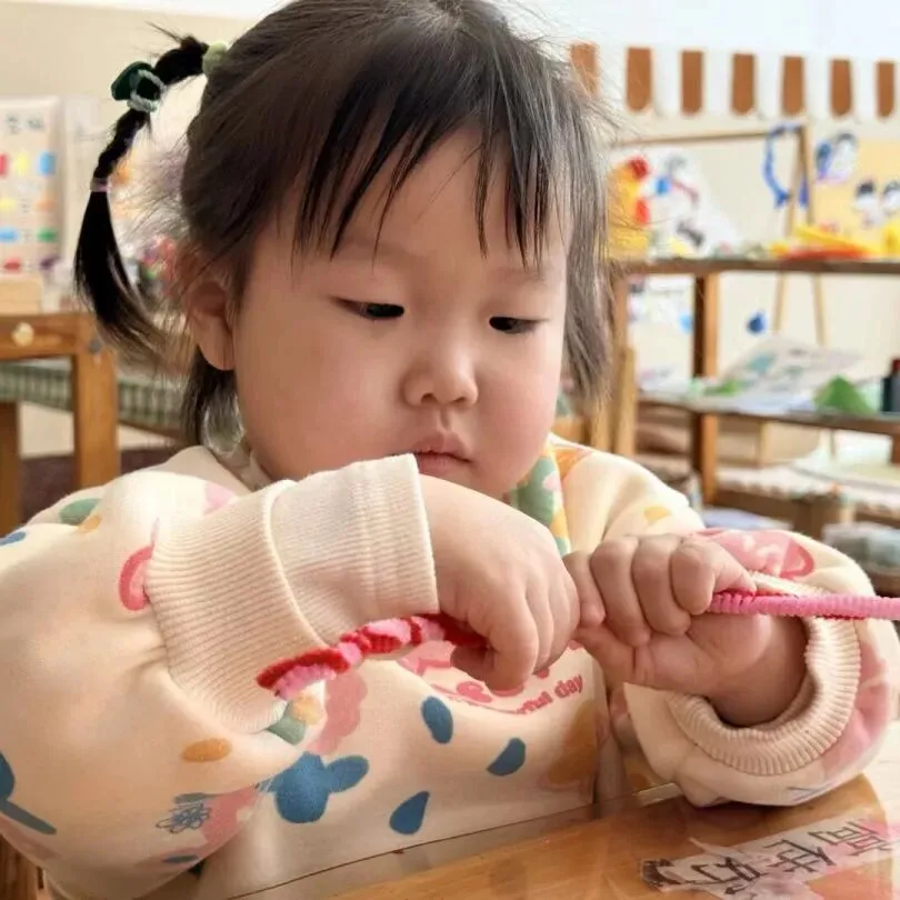 小一班宝贝们用马卡龙色扭扭棒弯出爱心、蝴蝶、小花。每一个独一无二作品,都藏着对妈妈满满的爱。孩子们认真练习祝福话语,准备把这份惊喜带回家。