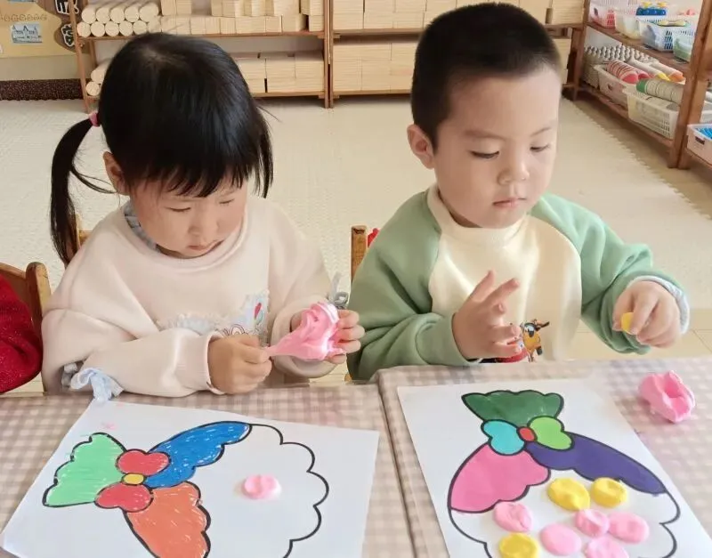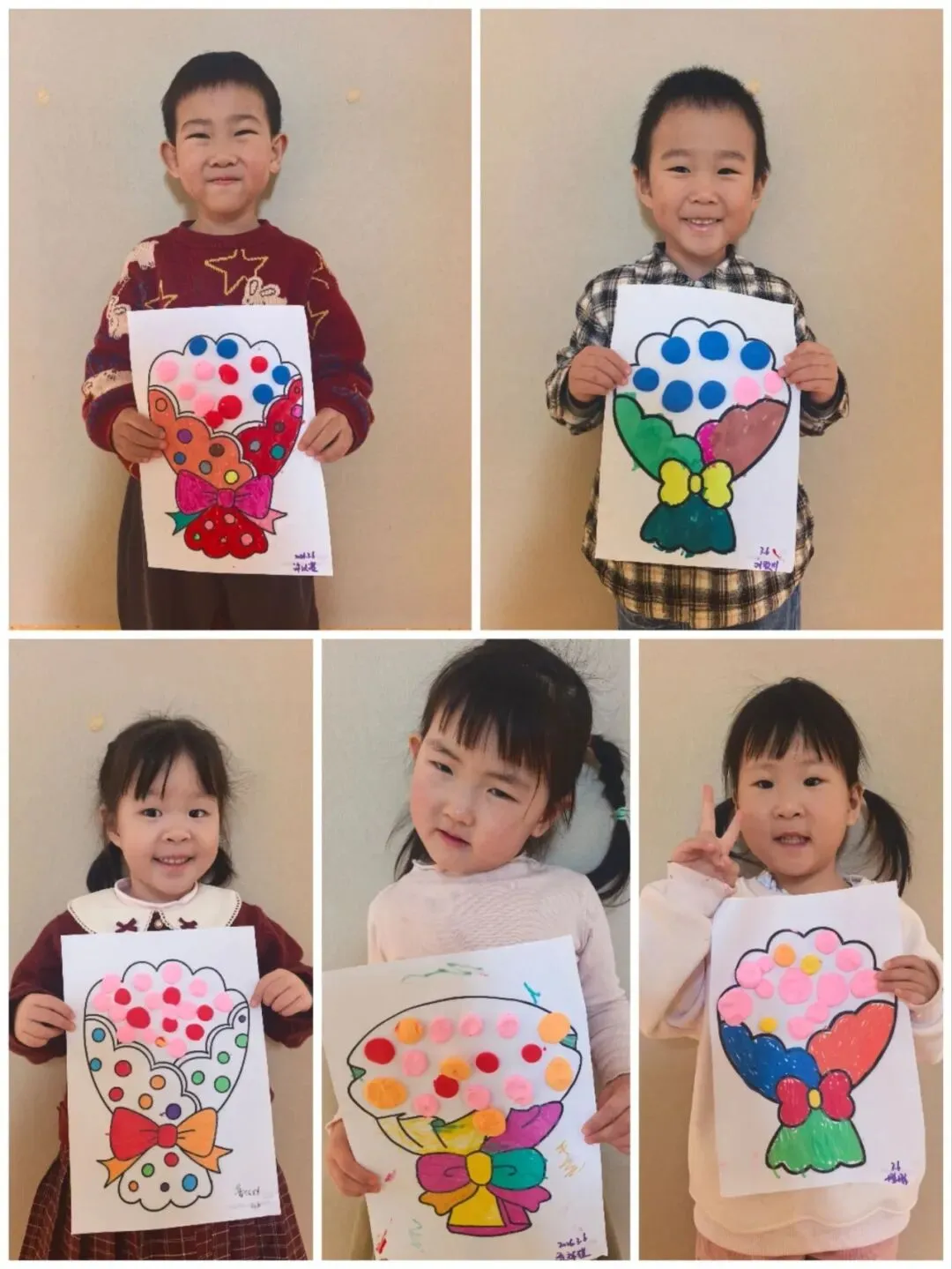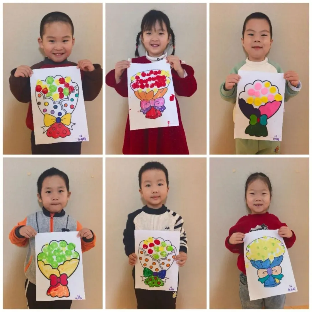 孩子们用海绵棒点出彩色花朵,或用彩笔突出色彩饱满的花团,再添画蝴蝶结。色彩斑斓的暖心花束,不仅锻炼了精细动作,更让孩子们在创作中懂得了感恩。
