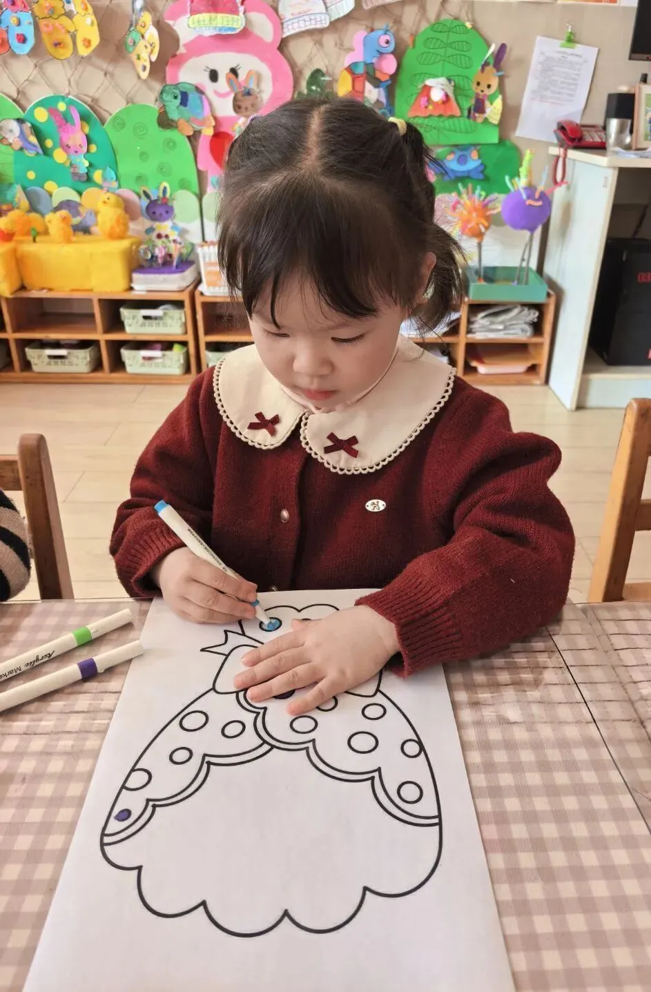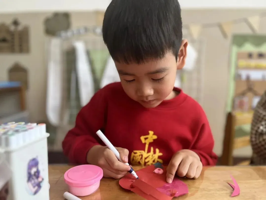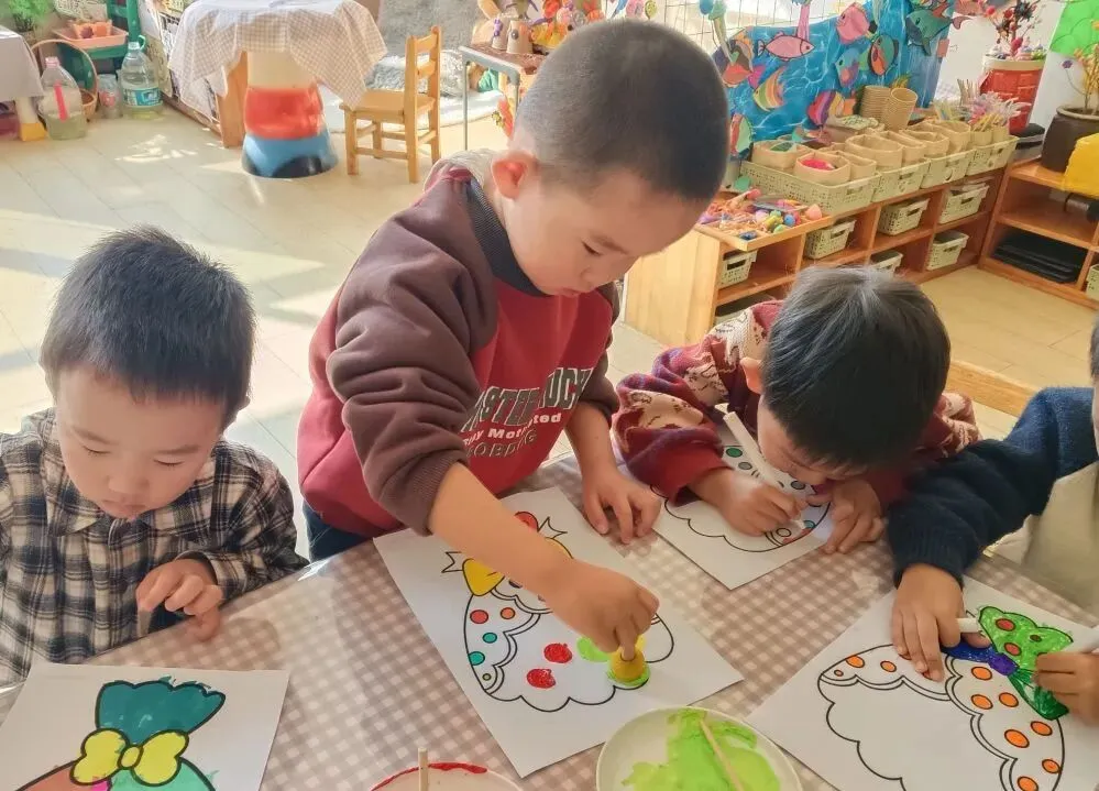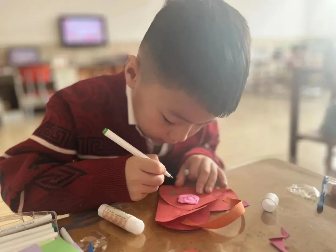 孩子们用海绵棒点出彩色花朵,或用彩笔突出色彩饱满的花团,再添画蝴蝶结。色彩斑斓的暖心花束,不仅锻炼了精细动作,更让孩子们在创作中懂得了感恩。