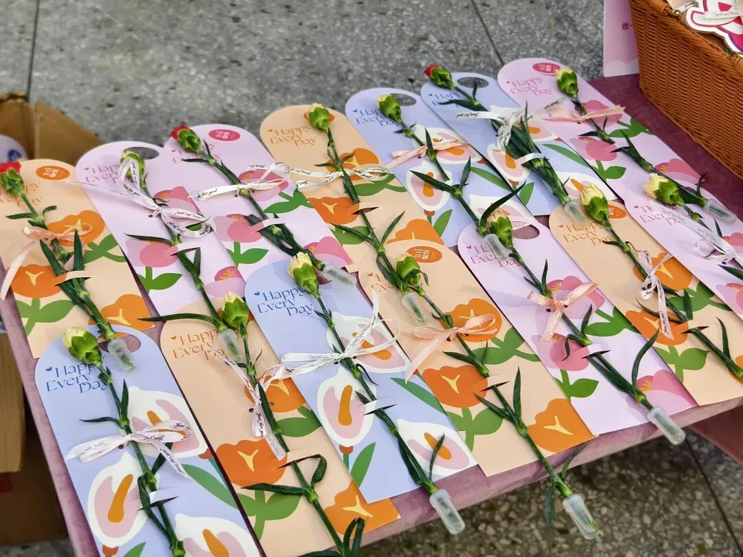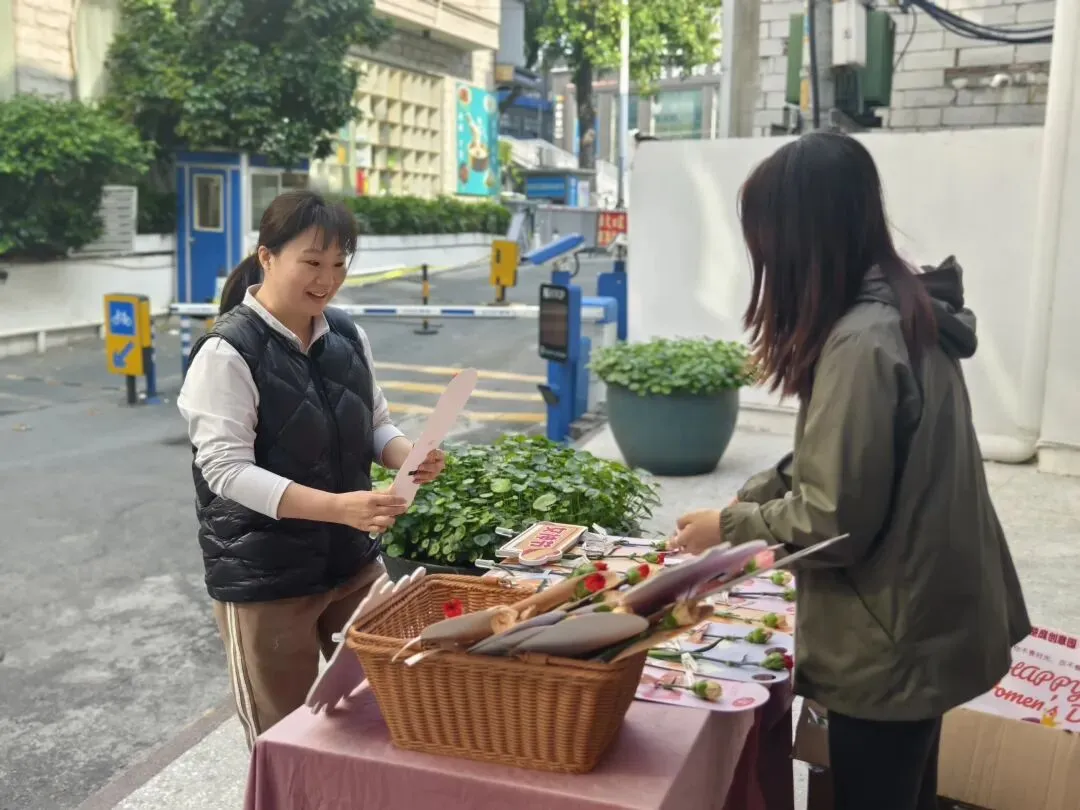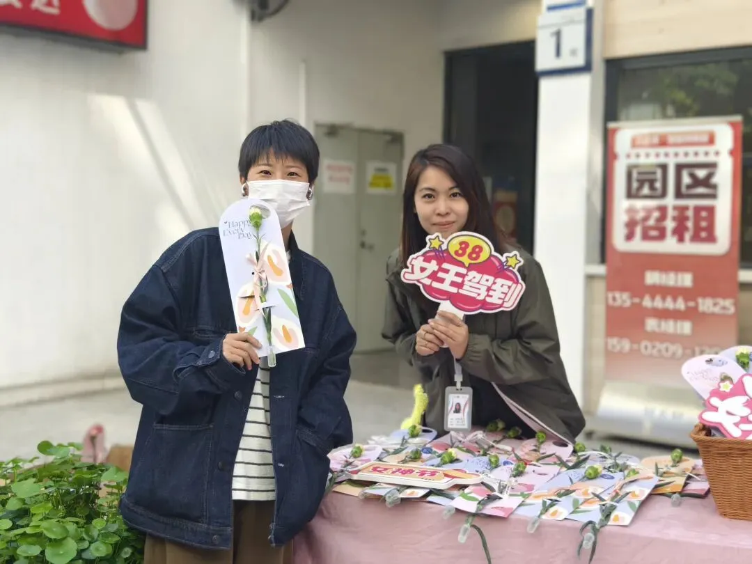 那一刻,匆忙的脚步为之一顿,疲惫的神情瞬间被惊喜点亮。接过鲜花的女士们或惊喜、或羞涩、或开怀大笑,有人拍照留念,有人轻嗅花香,有人将花轻轻抱在胸前……整个园区,因这一抹抹明媚的色彩,变得格外温柔。