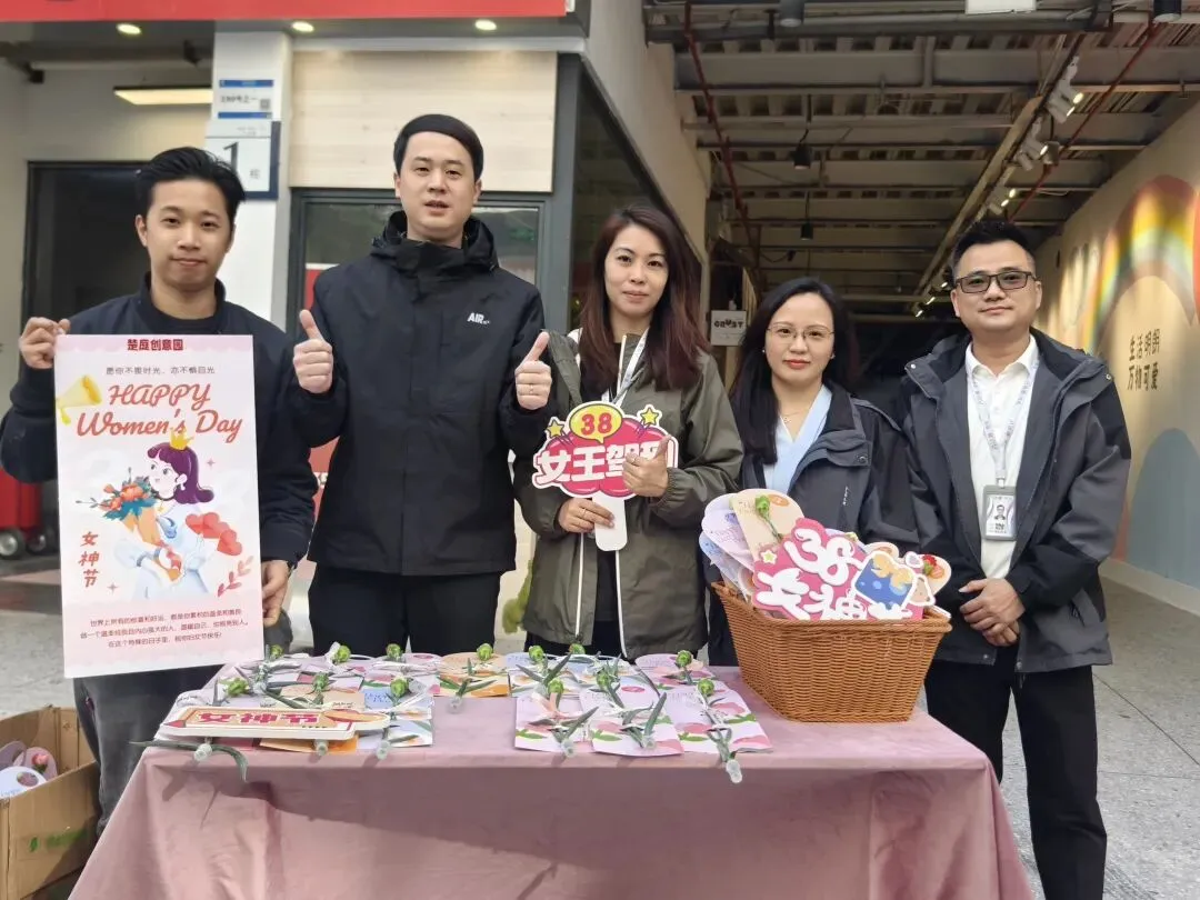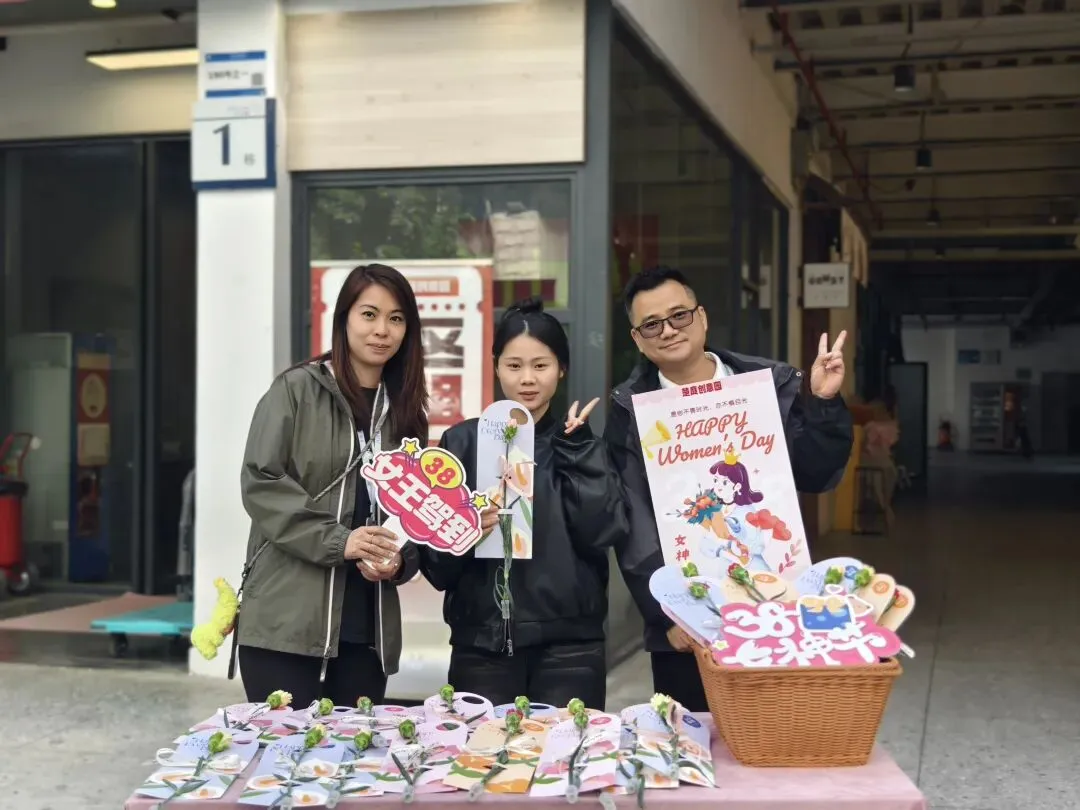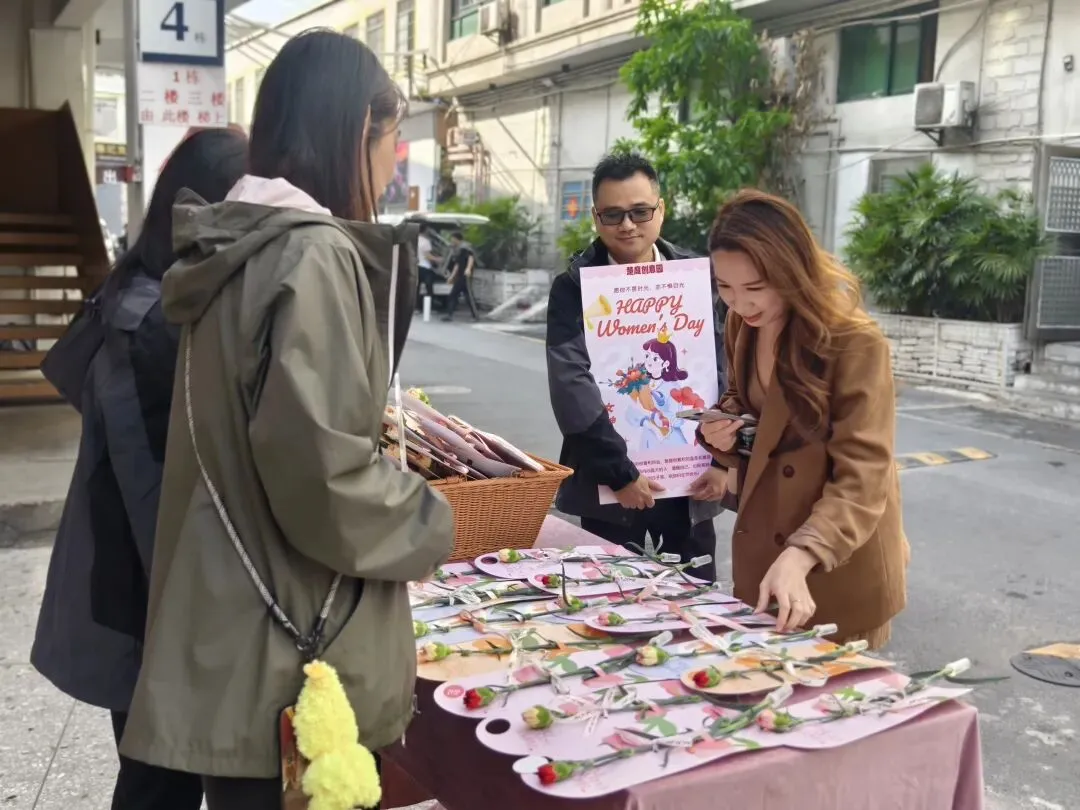 9:00起,在园区入口,物业人员面带微笑,手捧鲜花,化身为“春日信使”,向每一位入园的女性送上诚挚的节日问候:“女神节快乐!这束花送给最美的您!”
