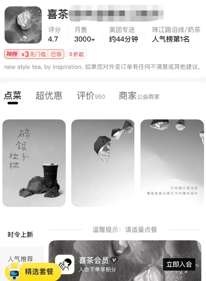 去年喜茶为了宣传新品“碎银子糯糯”,将美团、饿了么等平台的外卖界面全面改为黑白灰色调,部分门店头像同步变为黑白图标,被不少网友吐槽“像殡葬风格”,调侃这个想法“适合清明节宣传”。