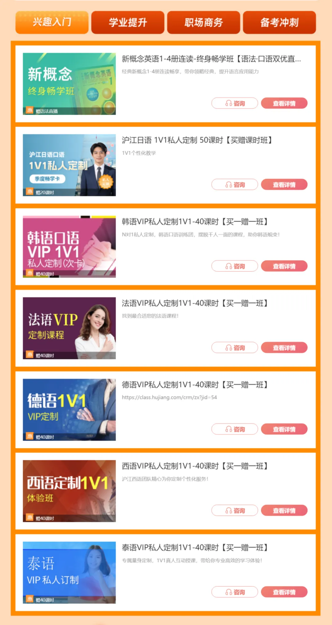 小语种买一赠一班,完全根据你的基础、空闲时间、学习目标定制内容,不用跟着赶进度。专业老师全程带学,不用自己瞎摸索走弯路,帮你稳稳拿下留学门槛。