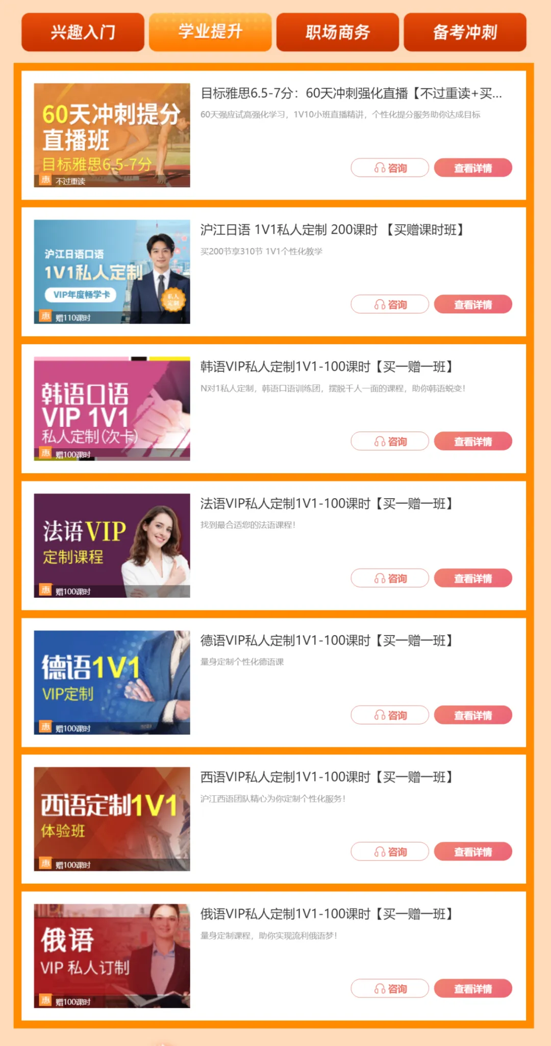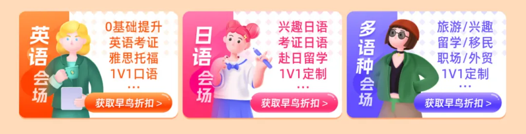 ✅ 英语课程折上减✅ 日语课程折上减✅ 多语种课程折上减多语种课程包含:韩语、法语、德语、西语、葡语、意大利语、俄语、泰语、拉丁语、越南语、阿拉伯语、粤语、上海话,等