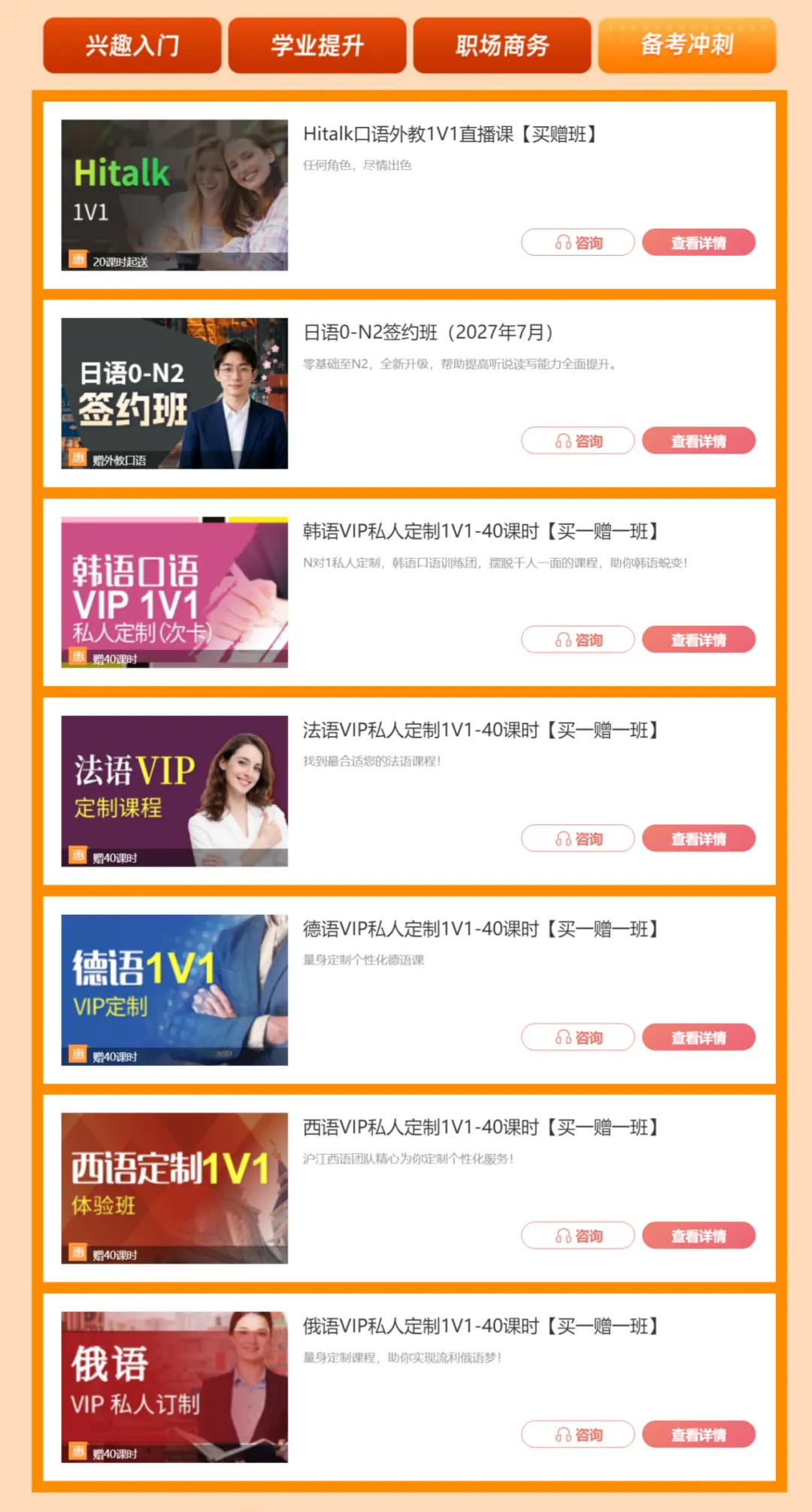 就想冲外语等级考、短期快速提分?小语种听说读写综合提升,1对1陪练,备考冲刺专属定制,短期高效提分,不走弯路,备考拿证同时兼顾口语提升,再也不用怕开口就慌。