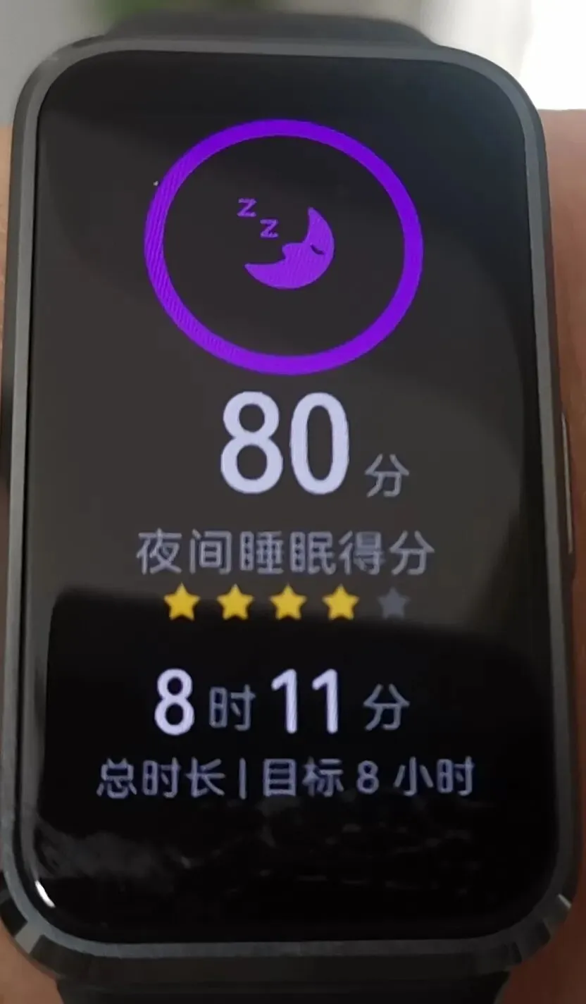 昨晚,是我第一次带着手环睡觉。完全醒清后,先看看手环记录的睡眠时间。夜间睡眠总时长是8个小时11分,得分80分。昨晚我明明十点多一点儿就去睡觉了,怎么总时长才8个小时呢?哦,想起来了,睡前拨拉了一会儿手机,又聊了一会天,那可都不算睡觉时间。