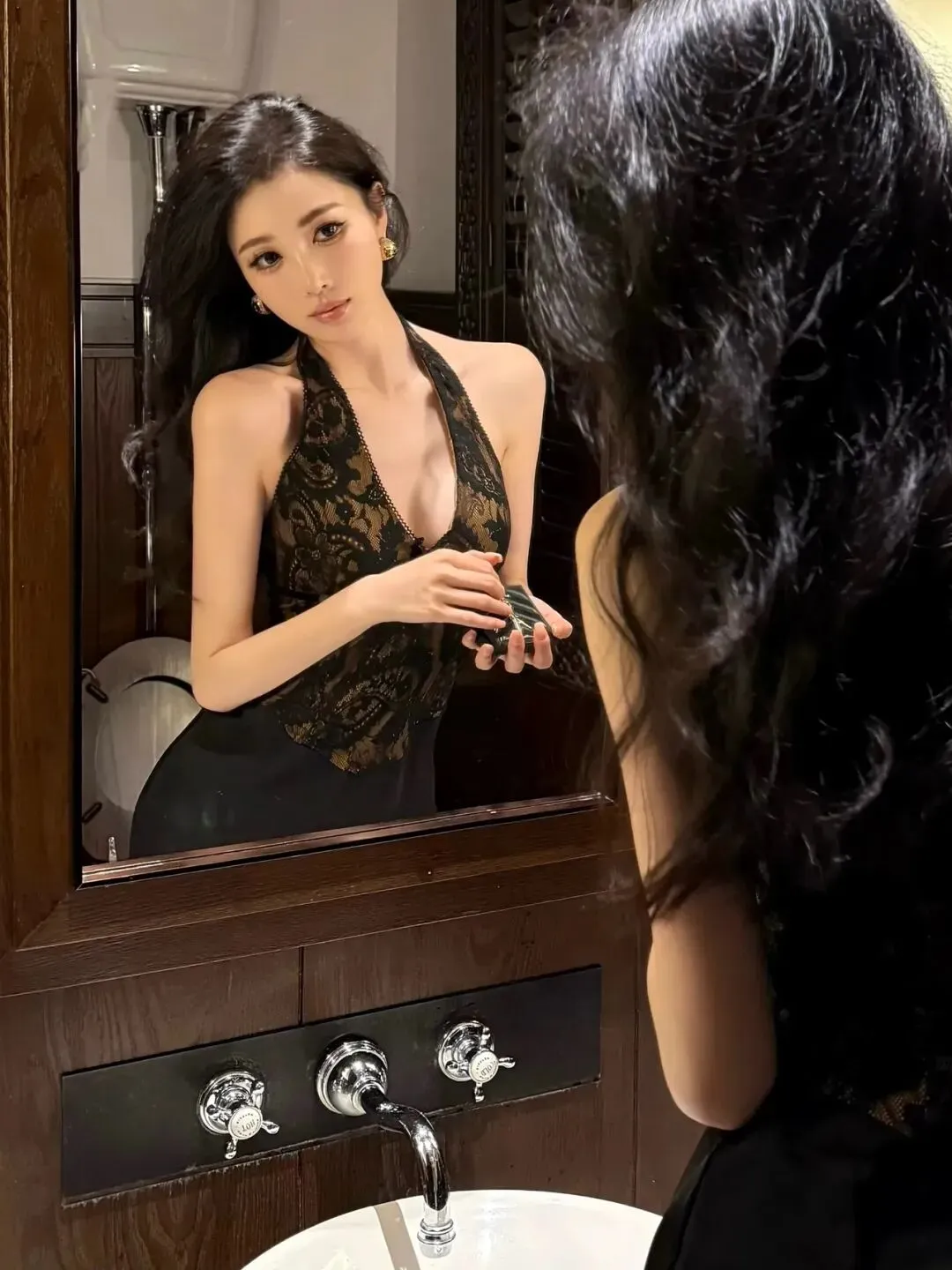侧身站在洗手台前,一手轻握小物件,一手自然垂落,身体微微前倾,背景是镜面与洗手台,氛围感拉满,温柔又有故事感。