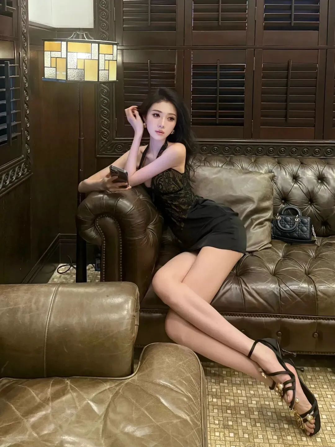 侧身趴在复古皮沙发上,双手轻托,身体微微侧转,背景是木质百叶窗与沙发,姿势慵懒又性感,纯欲感拉满。