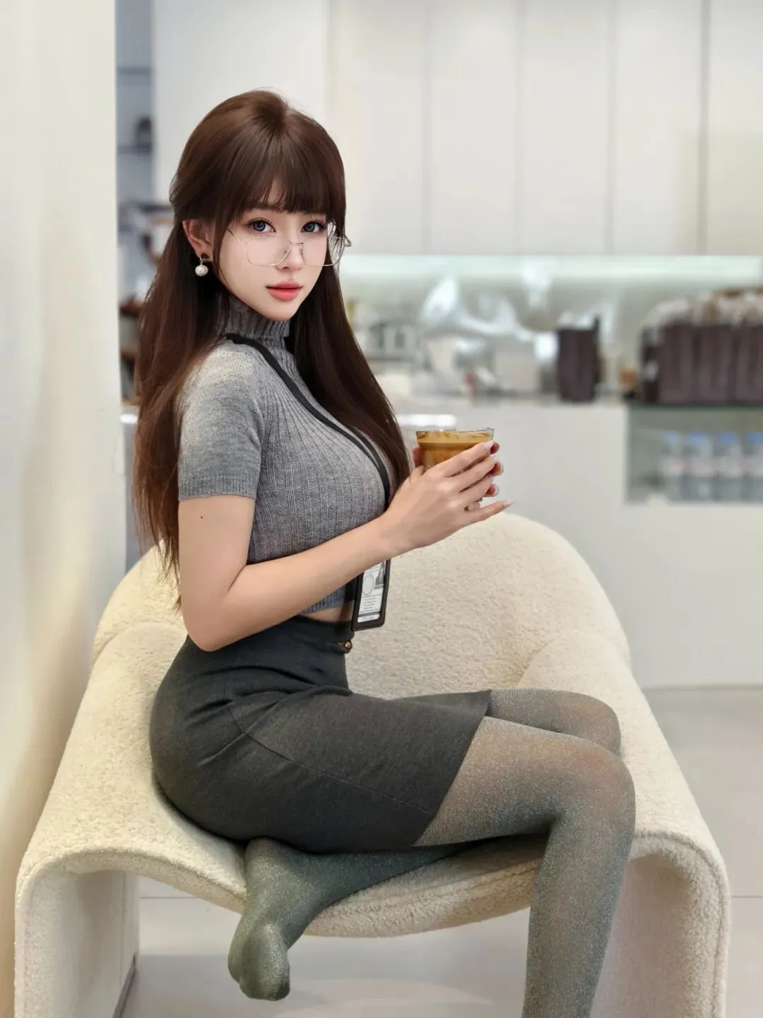 侧身坐在椅上,一手轻握咖啡杯,一手轻撩头发,身体微微侧转,背景是咖啡店吧台,俏皮又有细节,显灵动又有态度。
