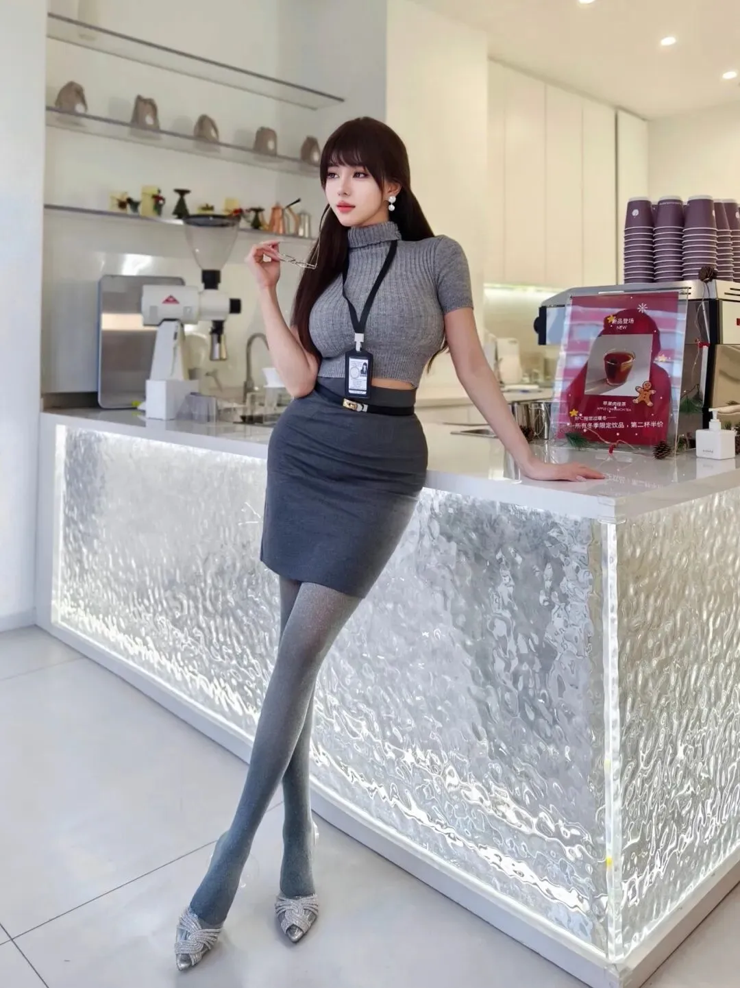 单手轻扶吧台,侧身站在咖啡店,身体微微侧转,背景是咖啡机与杯子,姿势冷艳又高级,轻松拿捏纯欲氛围感。