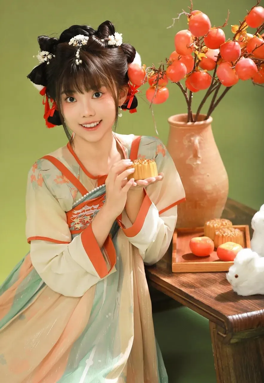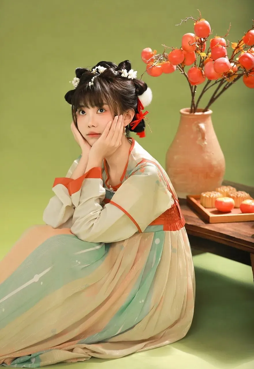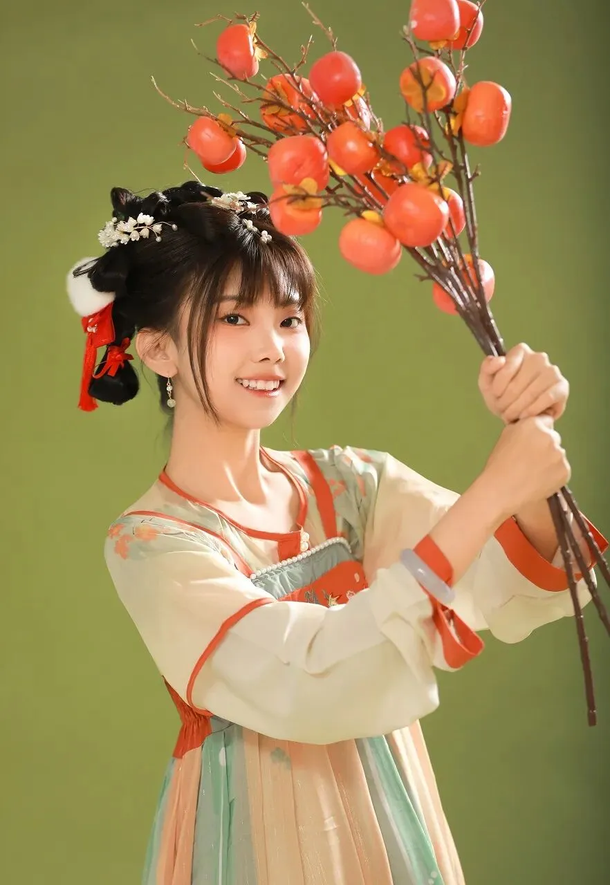 秋意渐浓,时光仿佛被染上了温暖的色调。在这个收获的季节,一位身着古风衣裳的少女,手持一束红柿,如从古老的画卷中款款走来,带着秋日的诗意与祥瑞,惊艳了时光。少女身着一件浅黄色的上衣,衣袖边缘和领口处点缀着橙红色的镶边,如同秋日里天边的晚霞,温暖而明亮。上衣上精致的花卉图案,仿佛是秋天在布料上留下的斑斓印记,细腻而生动。下身搭配的裙子色彩柔和,浅绿与米黄交织,似是秋日里依然翠绿的枝叶与成熟的麦田相映成趣。裙摆轻盈飘逸,随着少女的动作微微摆动,仿佛在诉说着秋日的私语。她的头发精心盘起,发髻上装饰着白色的花朵和毛茸茸的红色发饰,宛如从古典诗词中走出的佳人。白色花朵纯洁素雅,红色发饰鲜艳夺目,两者相互映衬,更添几分古典的韵味。发间垂下的红色流苏,随着少女的举止轻轻晃动,为整体造型增添了一丝灵动与俏皮。此刻,少女双手高高举起一束红柿,树枝上挂满了圆润饱满的柿子,橙红如火,在绿色背景的衬托下,显得格外耀眼。柿子,在传统文化中一直是吉祥的象征,“柿柿如意”,寓意着事事顺遂、如意吉祥。少女手持红柿,仿佛将这份美好的祝福也一同捧在了手中。