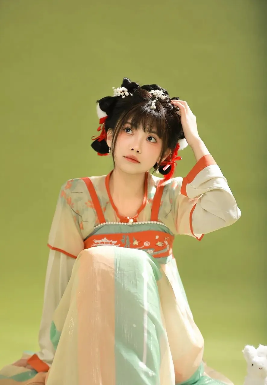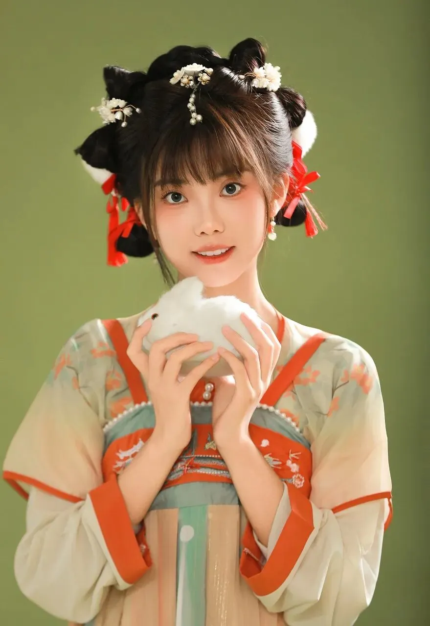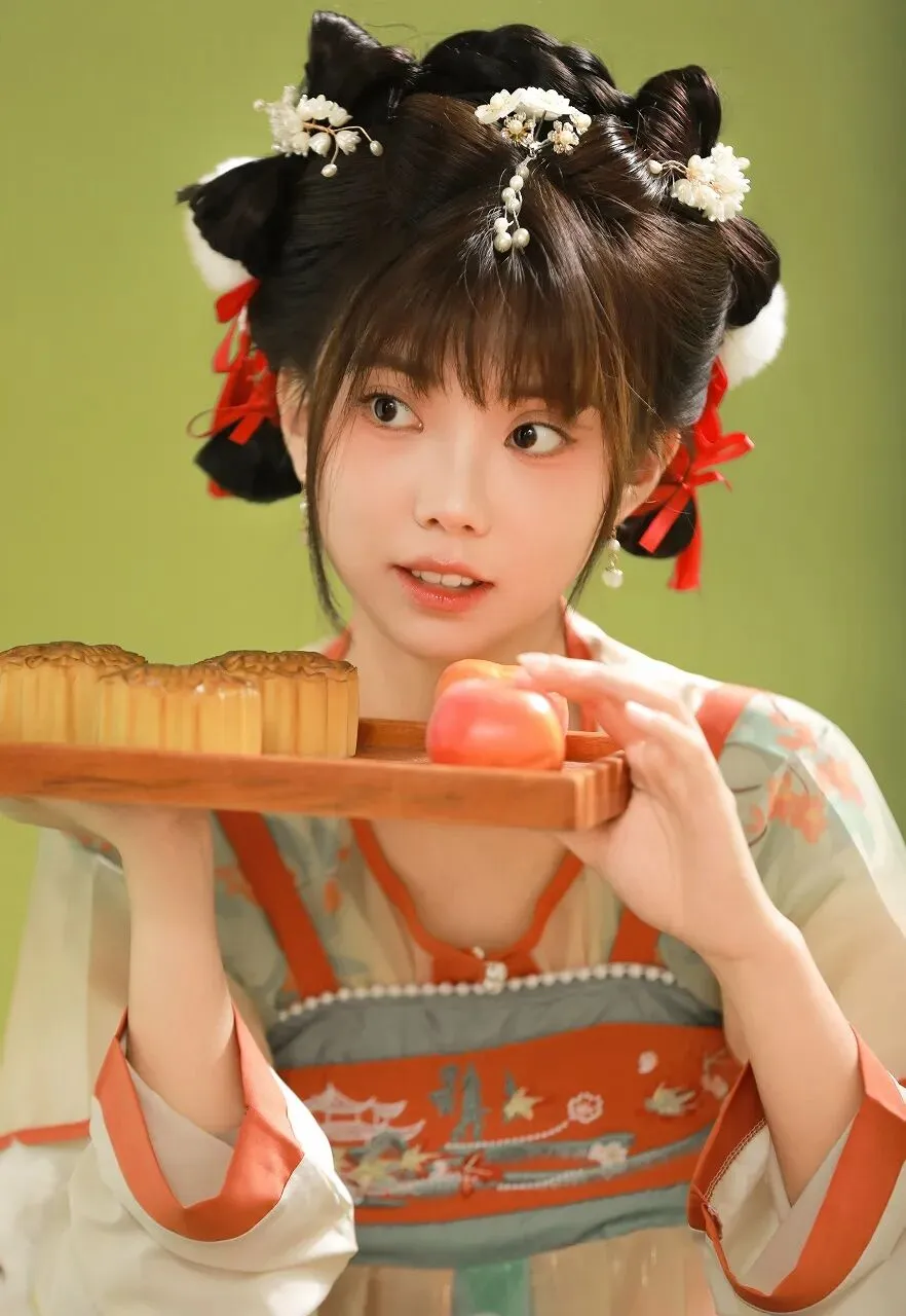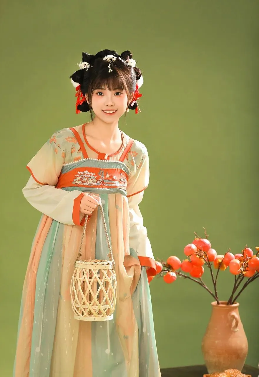 秋意渐浓,时光仿佛被染上了温暖的色调。在这个收获的季节,一位身着古风衣裳的少女,手持一束红柿,如从古老的画卷中款款走来,带着秋日的诗意与祥瑞,惊艳了时光。少女身着一件浅黄色的上衣,衣袖边缘和领口处点缀着橙红色的镶边,如同秋日里天边的晚霞,温暖而明亮。上衣上精致的花卉图案,仿佛是秋天在布料上留下的斑斓印记,细腻而生动。下身搭配的裙子色彩柔和,浅绿与米黄交织,似是秋日里依然翠绿的枝叶与成熟的麦田相映成趣。裙摆轻盈飘逸,随着少女的动作微微摆动,仿佛在诉说着秋日的私语。她的头发精心盘起,发髻上装饰着白色的花朵和毛茸茸的红色发饰,宛如从古典诗词中走出的佳人。白色花朵纯洁素雅,红色发饰鲜艳夺目,两者相互映衬,更添几分古典的韵味。发间垂下的红色流苏,随着少女的举止轻轻晃动,为整体造型增添了一丝灵动与俏皮。此刻,少女双手高高举起一束红柿,树枝上挂满了圆润饱满的柿子,橙红如火,在绿色背景的衬托下,显得格外耀眼。柿子,在传统文化中一直是吉祥的象征,“柿柿如意”,寓意着事事顺遂、如意吉祥。少女手持红柿,仿佛将这份美好的祝福也一同捧在了手中。