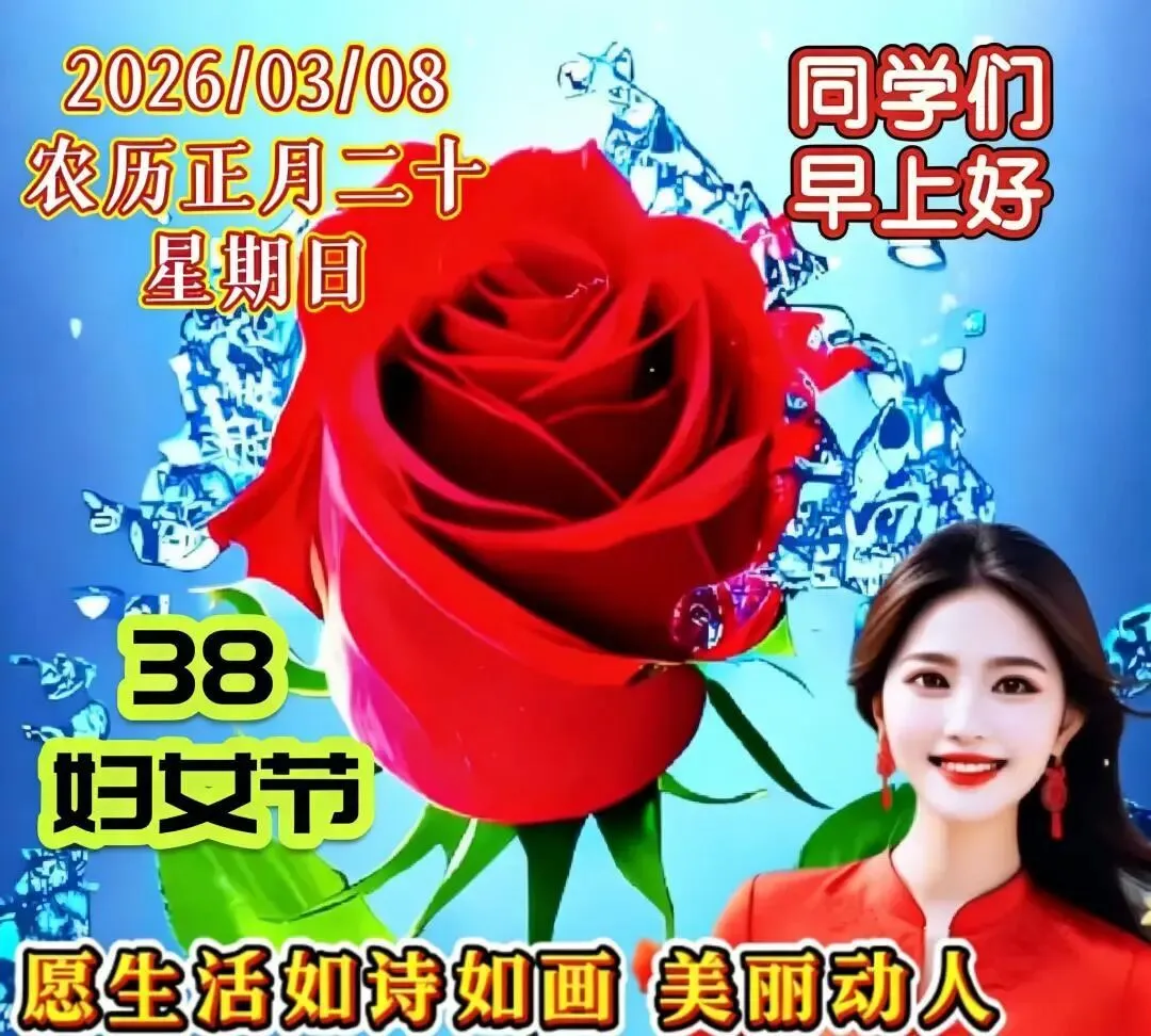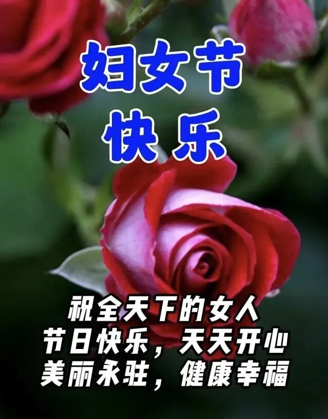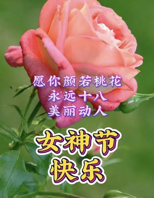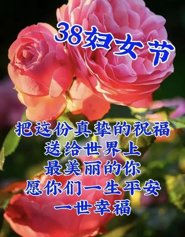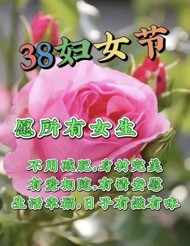 每年三八节,祝身边所有女同胞——健康常驻,爱情入蜜,家庭欢乐,金钱不缺,工作步步高。愿美丽和好运一直做你的跟班。