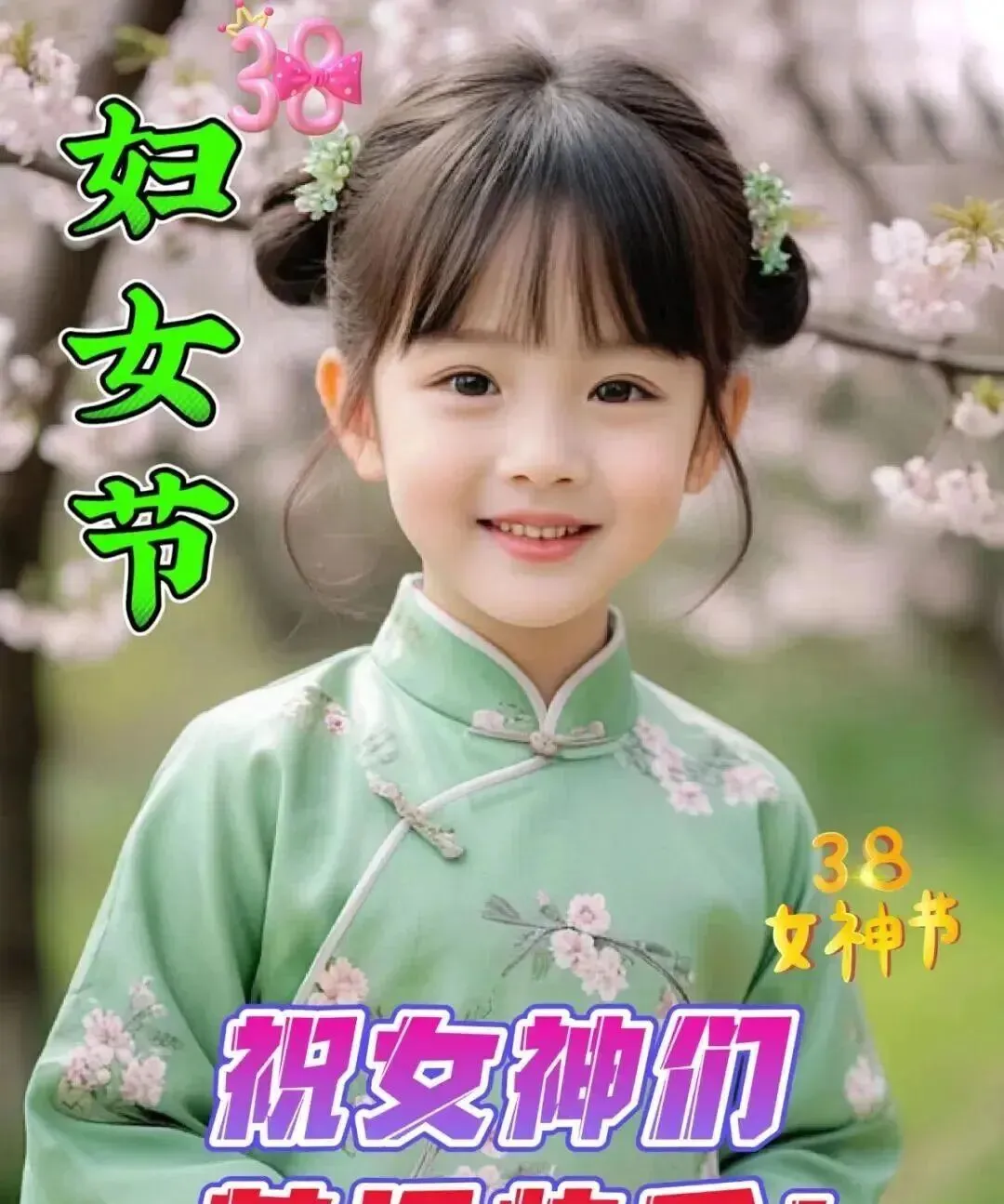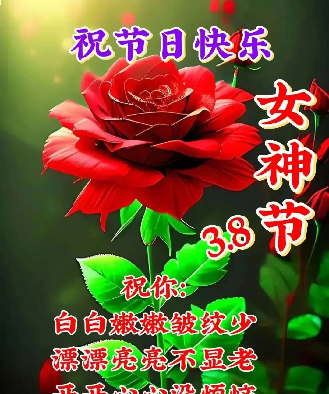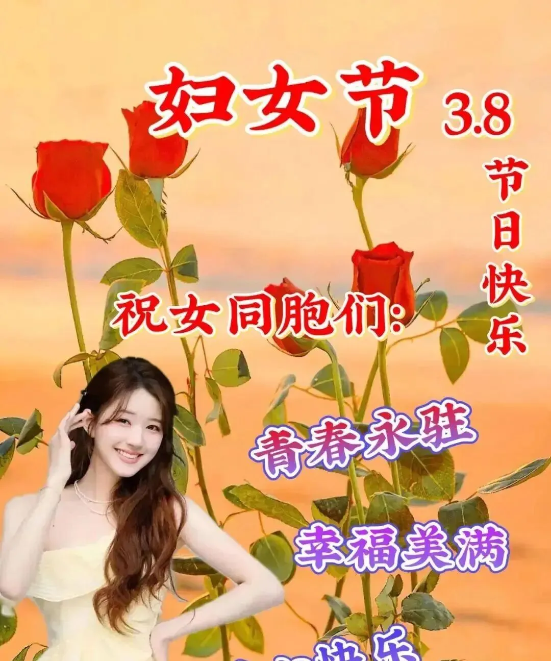 每年三八节,祝身边所有女同胞——健康常驻,爱情入蜜,家庭欢乐,金钱不缺,工作步步高。愿美丽和好运一直做你的跟班。