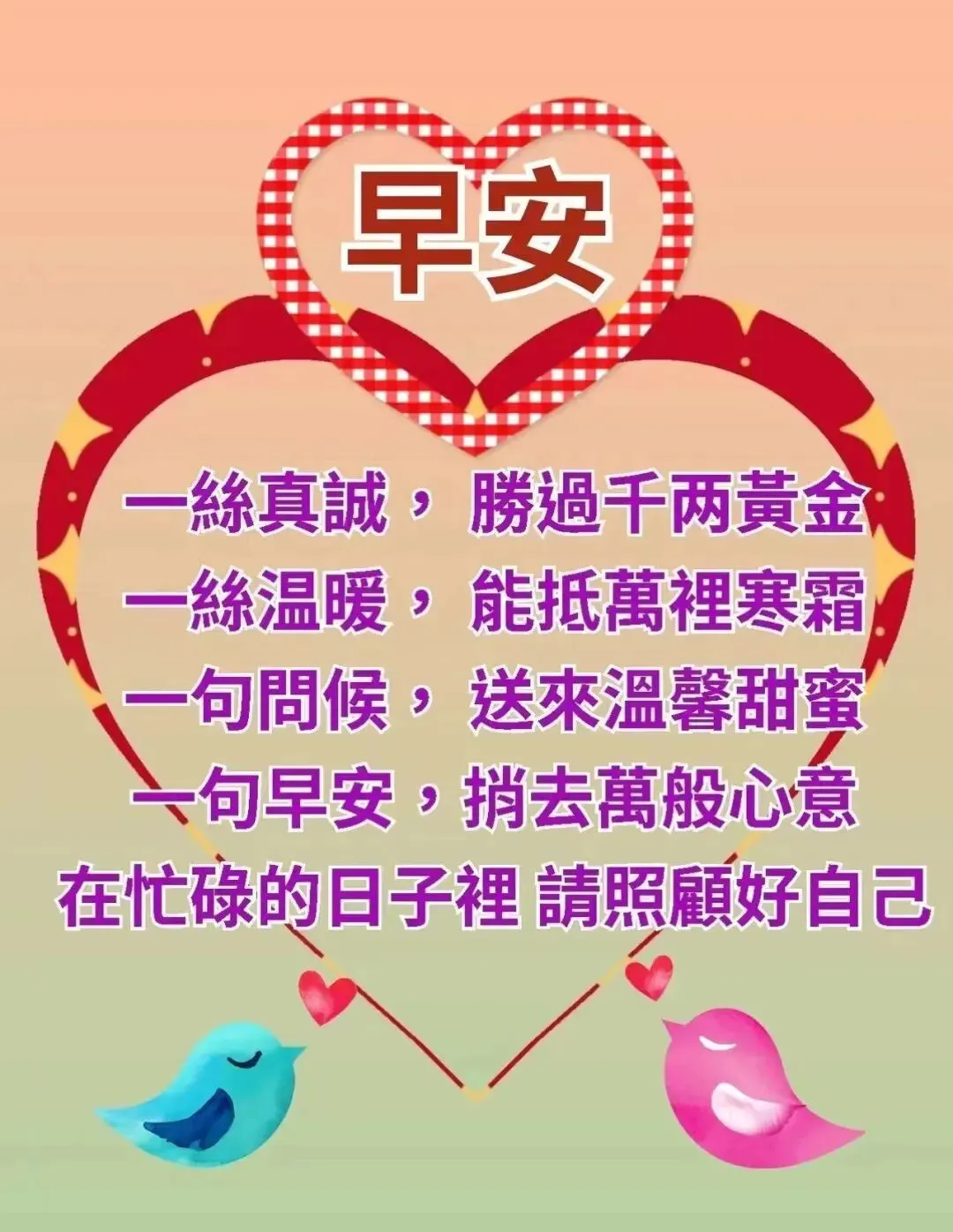 9,生活路上,人为贵;相互往来,情为贵;你言我语,诚为贵;开心传递,乐为贵;身体安康,比金贵。彼此的关怀,是修来的福;相互的问候,是难求的缘;让我们在祝福中,度过美好的每一天!早上好!